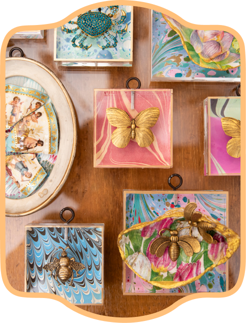 Explore our collection of Museum Bees crafted by Trace Mayer, featuring antique frame fragments from the 19th century. Discover captivating shapes adorned with a variety of ornaments, including the iconic Napoleon's Bee. Each is an original work of art!