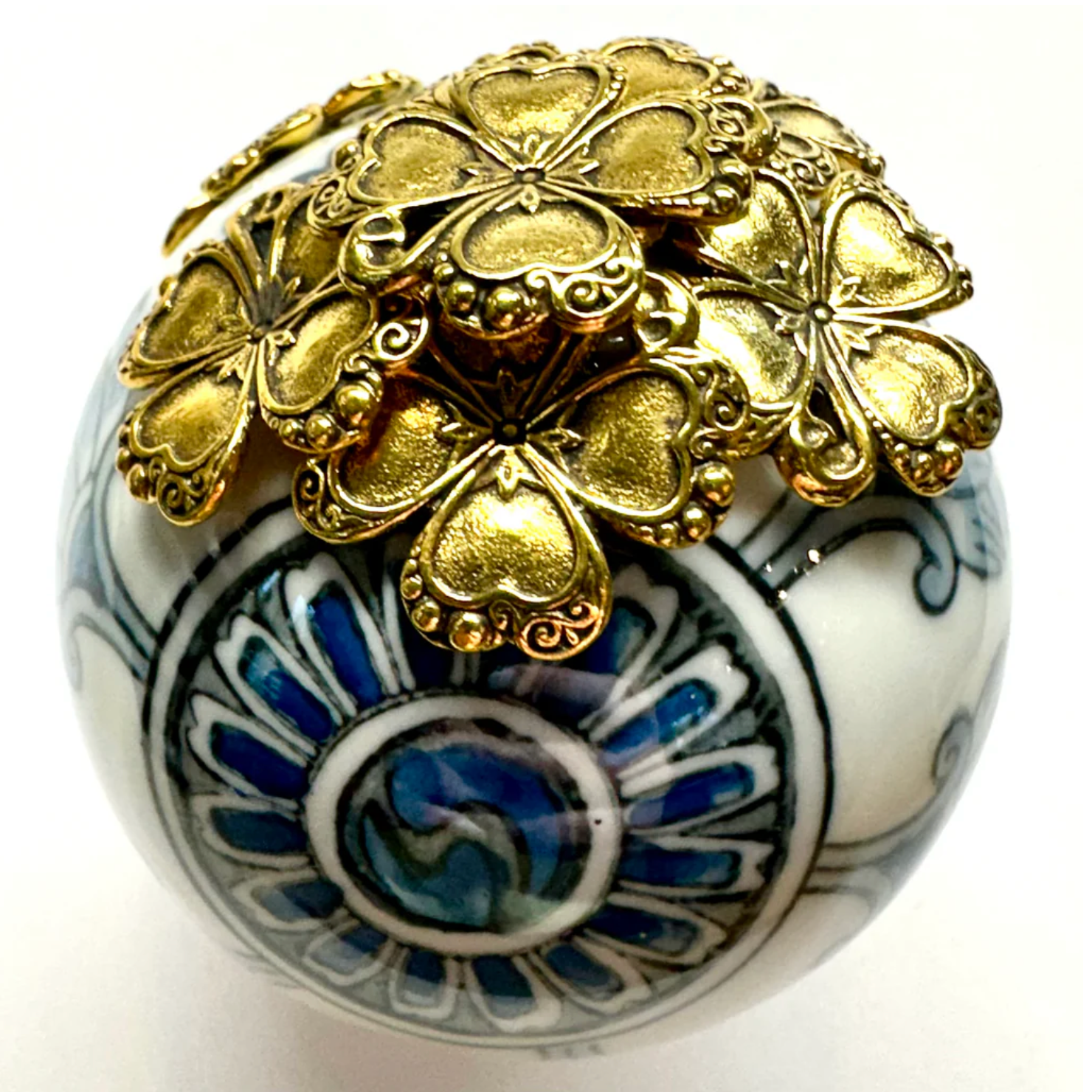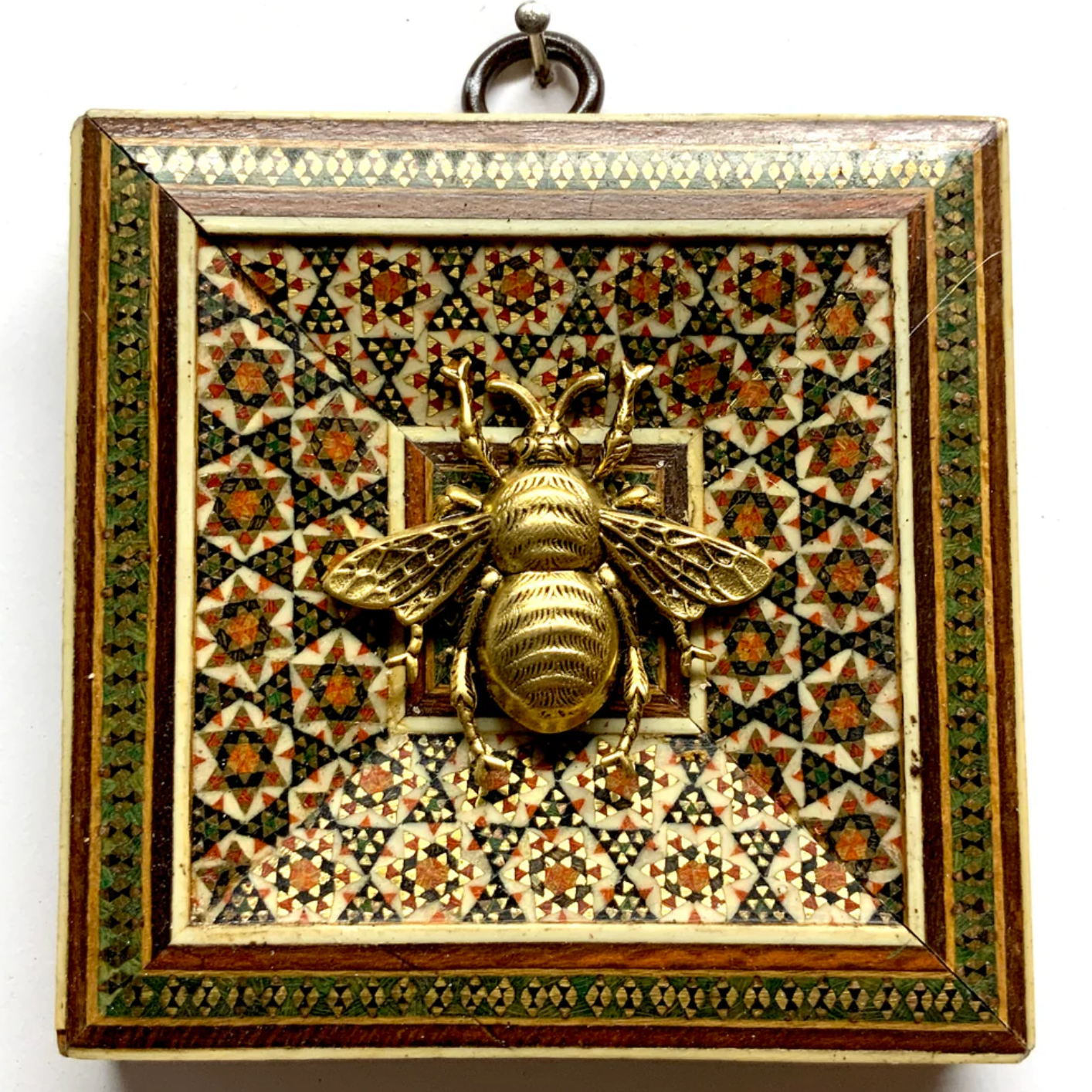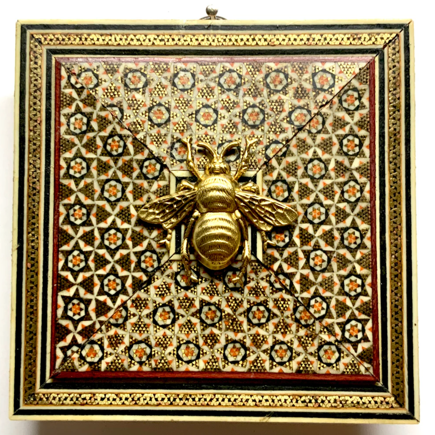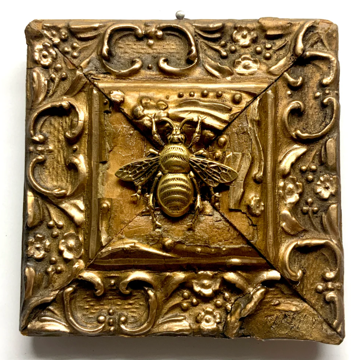 Trace Mayer uses antique frame fragments from 1860-80 to form charming and interesting shapes. In the center, various ornaments are showcased, the first of which was Napoleon's Bee. What has transpired over the years is a phenomenon anyone and everyone can get excited about and be a part of. Bees have expanded to include many other gems, including other animals, insects, and even personal items such as a medal or a unique family heirloom. Small antique objects are also showcased, including horse brass, pre-Columbian fragments, or small cameos.