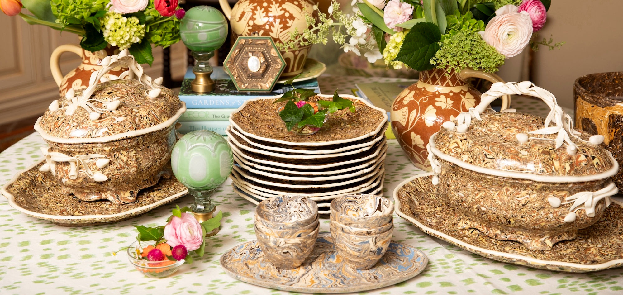 "Aptware is a beautifully marbleized faience pottery, naturally inspired by the colored soils in Apt, a small town in France. Apt's mixed clay ceramics are world-renowned. I was overjoyed when I came across a skilled artisan residing in that region and discovered she is one of the last remaining masters of this art form. I am thrilled to provide access to this highly specialized and sought-after product. However, it is usually considered a very special order. Keep in mind the delivery times range anywhere from 8 weeks at certain times of the year to 8 months at other times. The images displayed under "Aptware from France* are samples of aptware I have seen when visiting the workshops. Please inquire with any questions! We often feature pieces I purchase while in Apt in the shops. However, most aptware sells very quickly, and keeping any of the traditional aptware in stock is difficult.