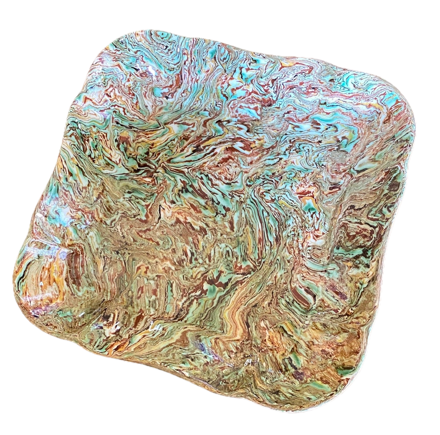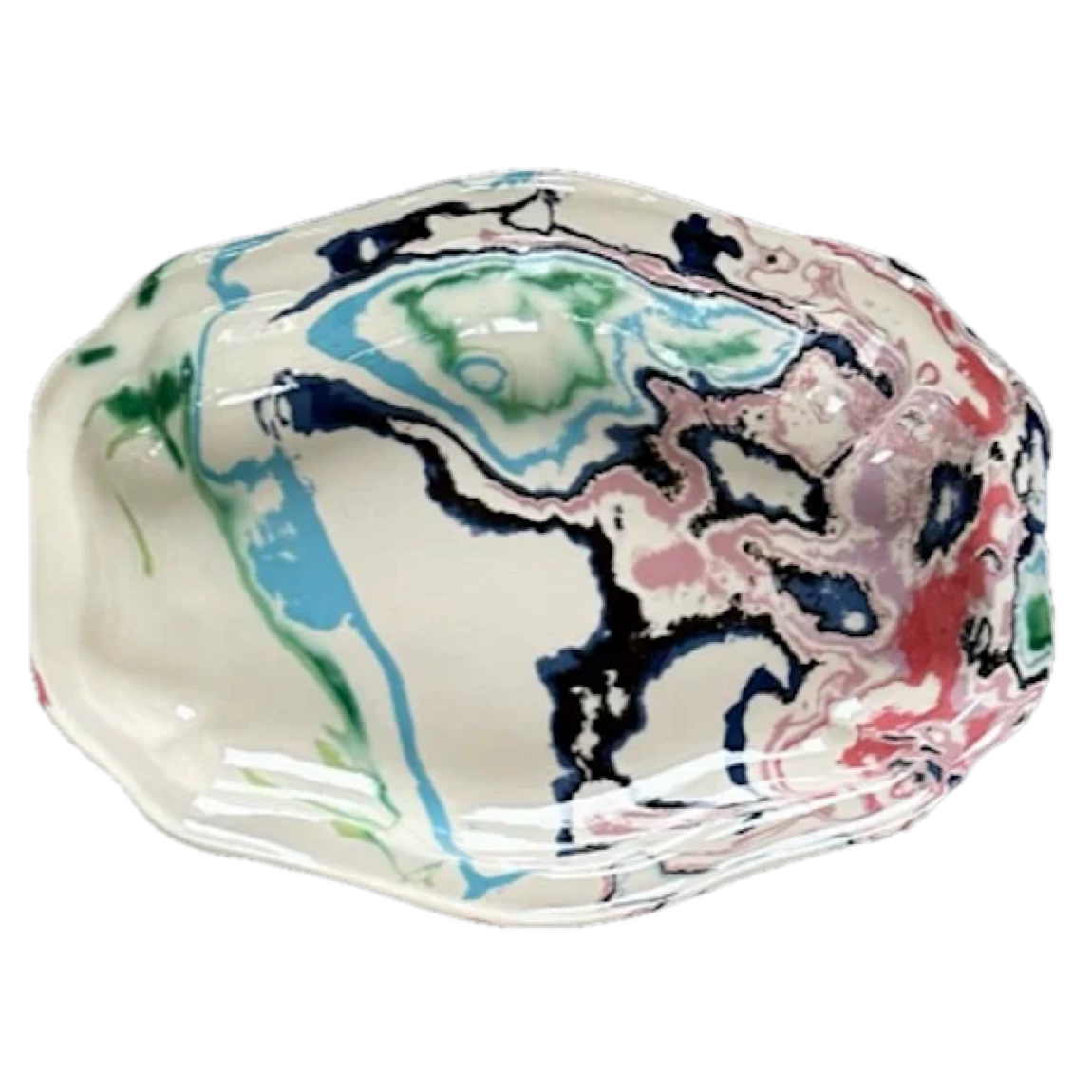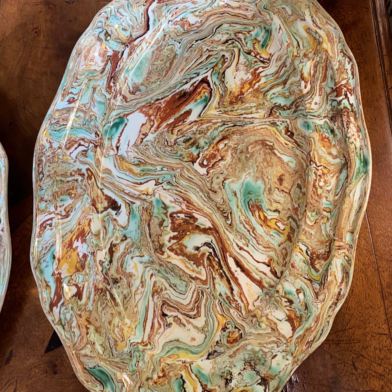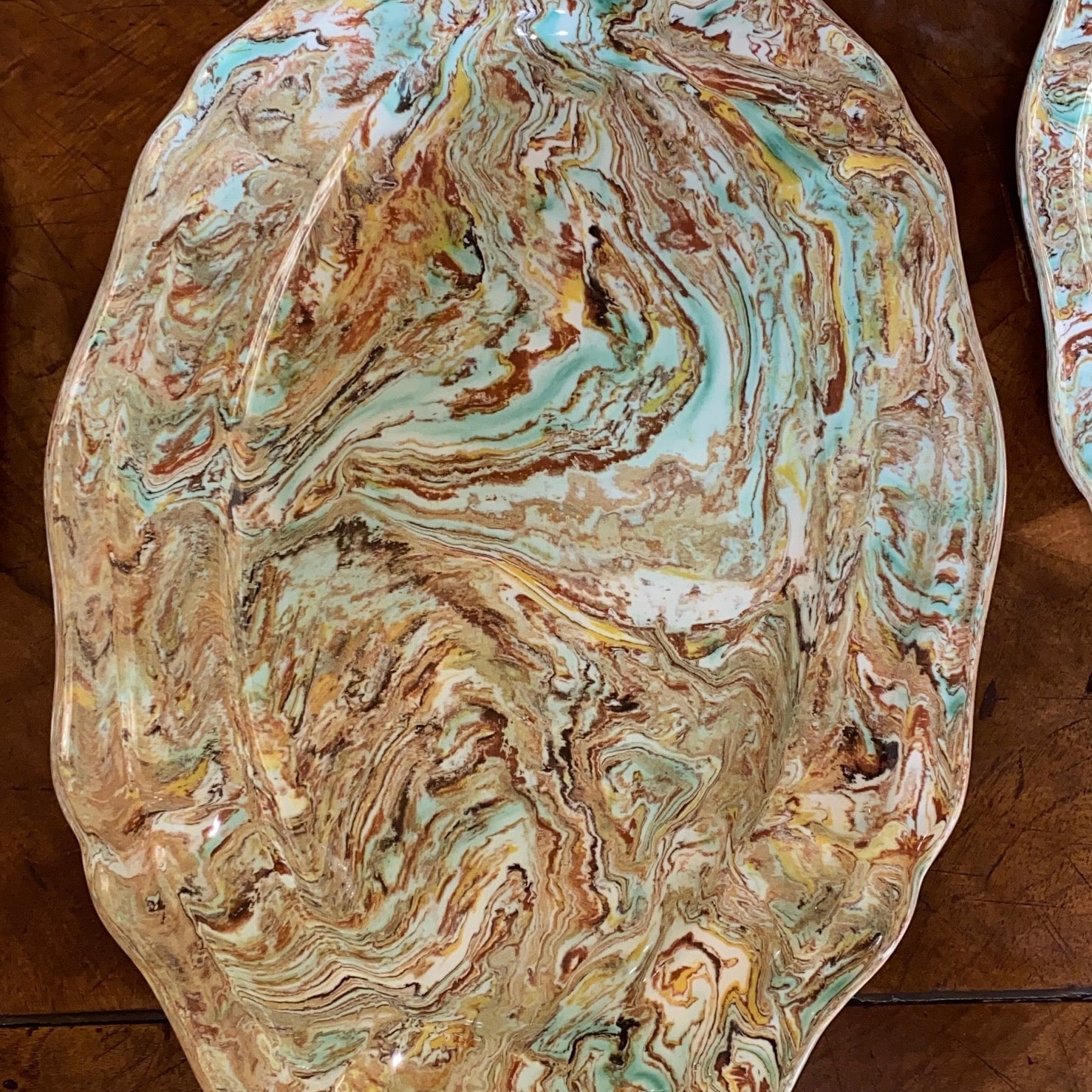 "Aptware is a beautifully marbleized faience pottery, naturally inspired by the colored soils in Apt, a small town in France. Apt's mixed clay ceramics are world-renowned. I was overjoyed when I came across a skilled artisan residing in that region and discovered she is one of the last remaining masters of this art form. I am thrilled to provide access to this highly specialized and sought-after product. However, it is usually considered a very special order. Keep in mind the delivery times range anywhere from 8 weeks at certain times of the year to 8 months at other times. The images displayed under "Aptware from France* are samples of aptware I have seen when visiting the workshops. Please inquire with any questions! We often feature pieces I purchase while in Apt in the shops. However, most aptware sells very quickly, and keeping any of the traditional aptware in stock is difficult.