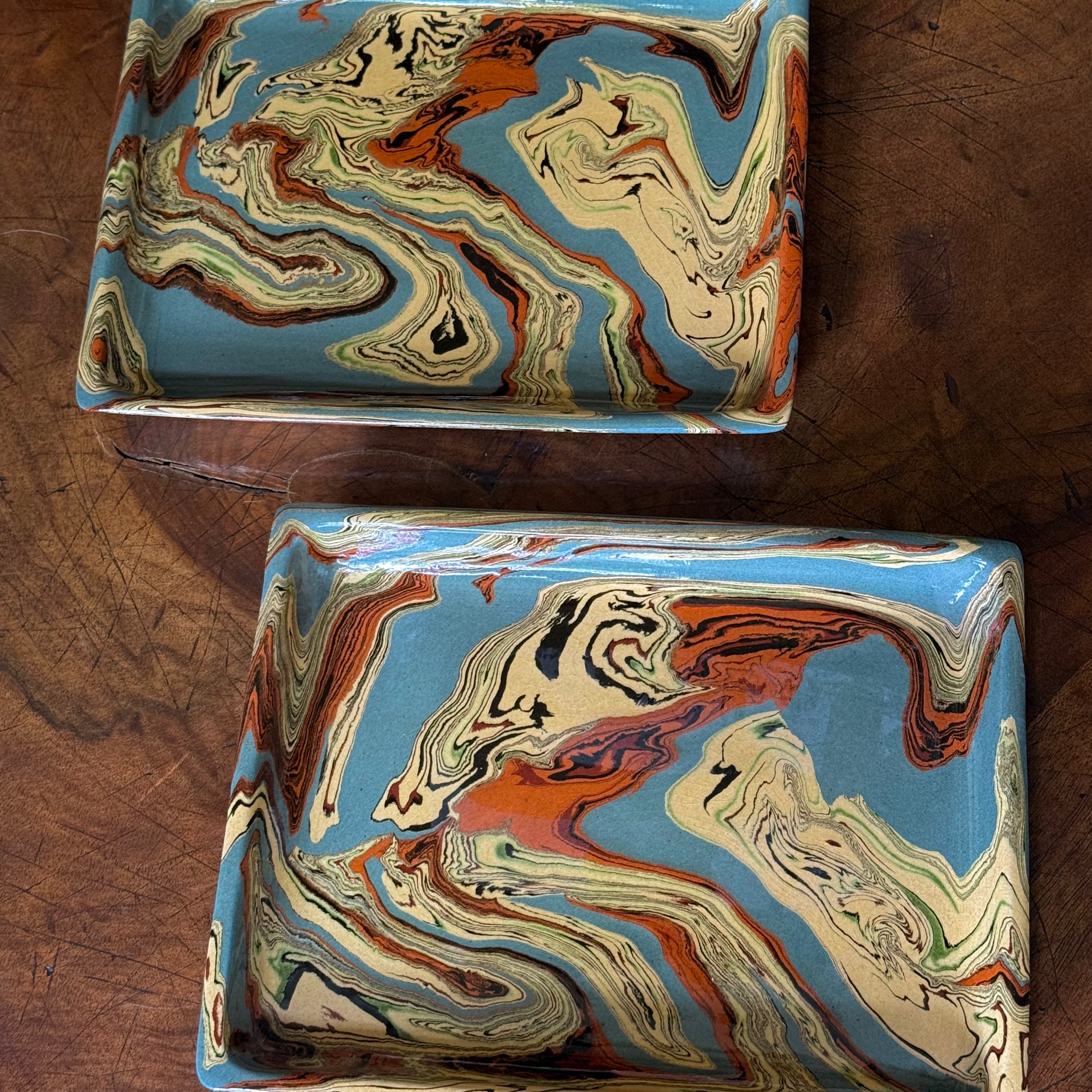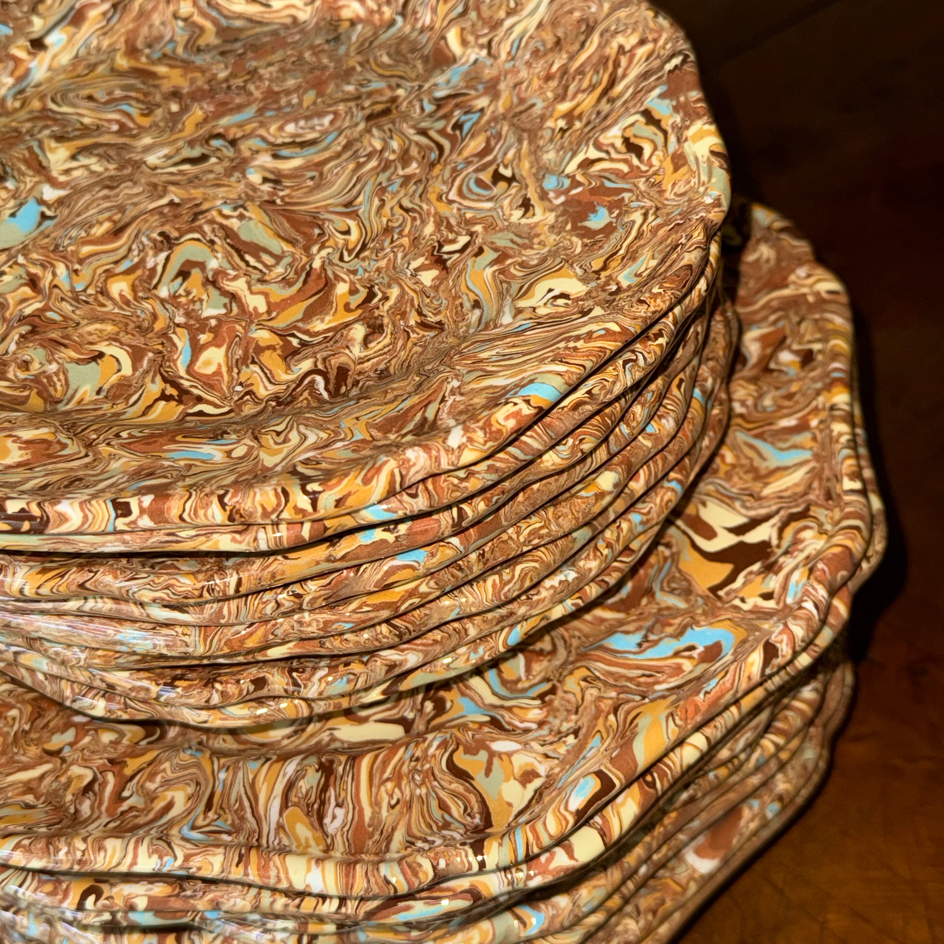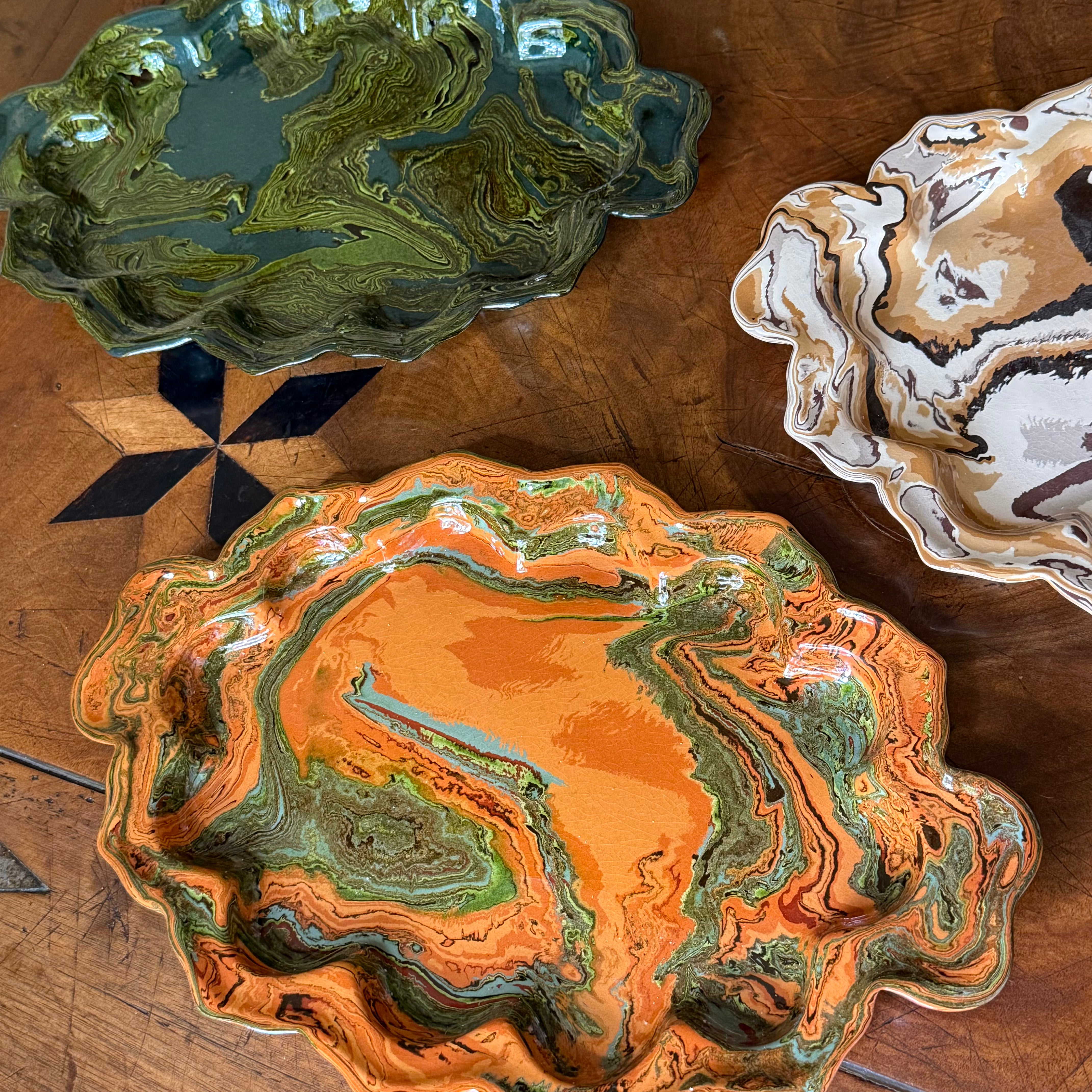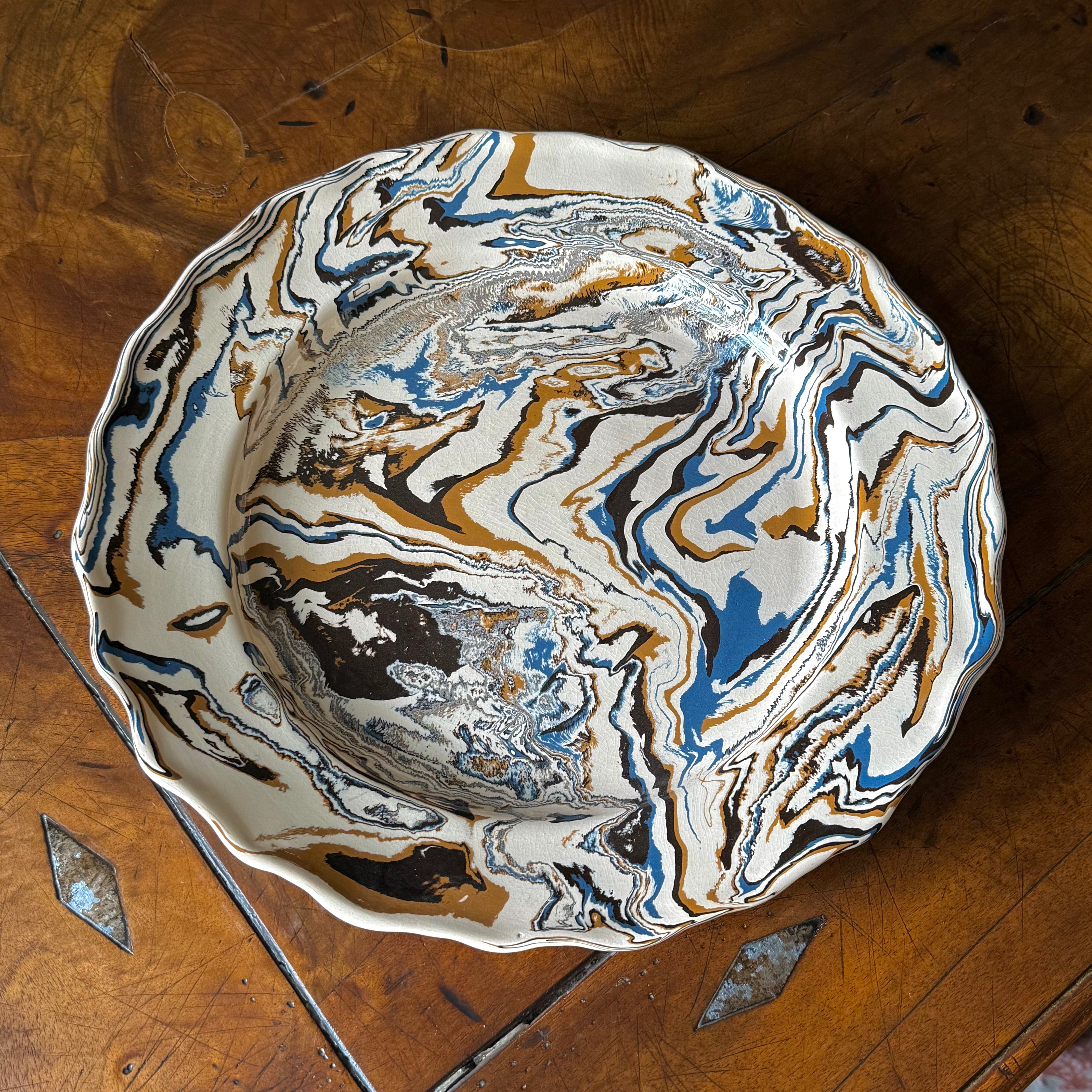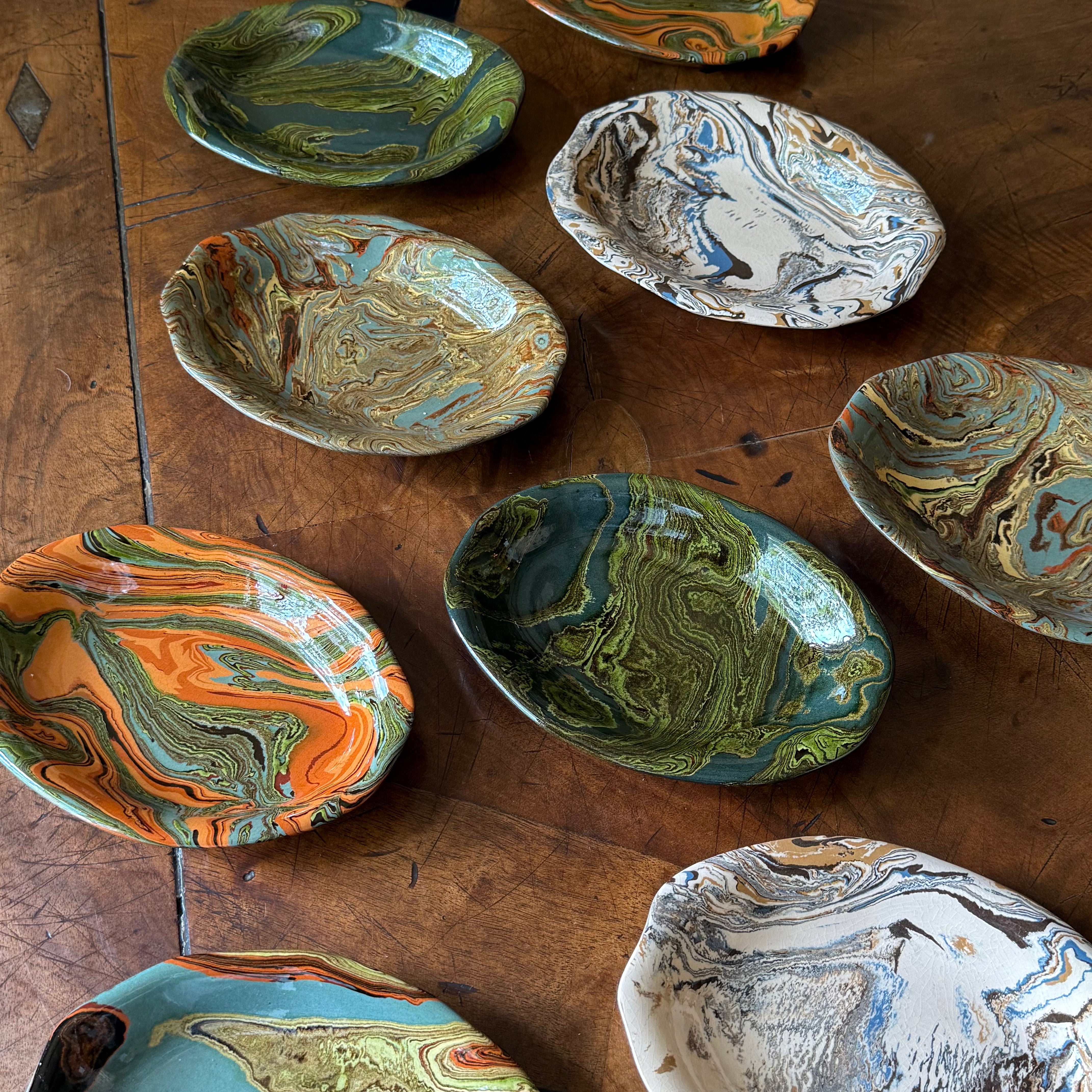 "Aptware is a beautifully marbleized faience pottery, naturally inspired by the colored soils in Apt, a small town in France. Apt's mixed clay ceramics are world-renowned. I was overjoyed when I came across a skilled artisan residing in that region and discovered she is one of the last remaining masters of this art form. I am thrilled to provide access to this highly specialized and sought-after product. However, it is usually considered a very special order. Keep in mind the delivery times range anywhere from 8 weeks at certain times of the year to 8 months at other times. The images displayed under "Aptware from France* are samples of aptware I have seen when visiting the workshops. Please inquire with any questions! We often feature pieces I purchase while in Apt in the shops. However, most aptware sells very quickly, and keeping any of the traditional aptware in stock is difficult.
