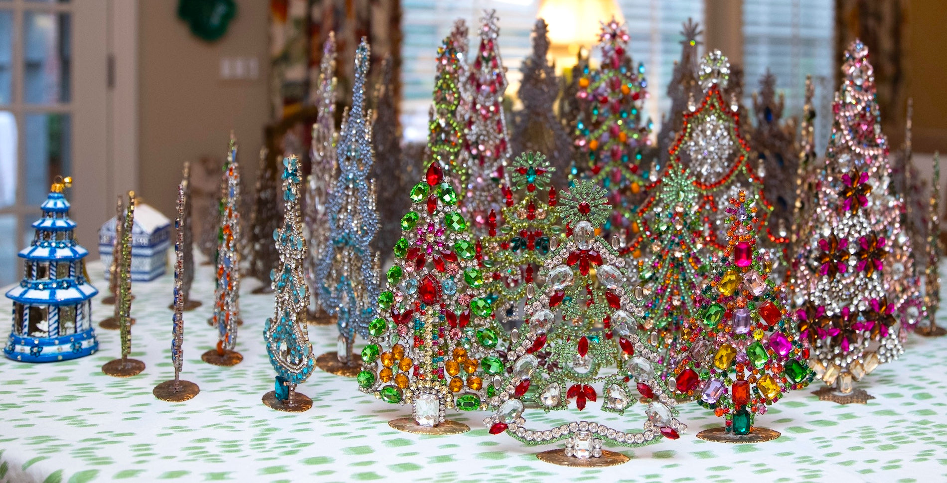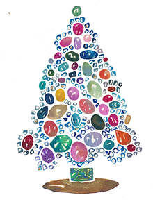 These special sparkly Czech Christmas trees showcase the elaborate designs Czechs are famous for. Between the mid-1920s and the 1950s, the jewels made in Czechoslovakia were heavily soldered with copper and pot metal, which is a mixture of semi-precious metals. That is what you see on the back of these super sparkly trees.