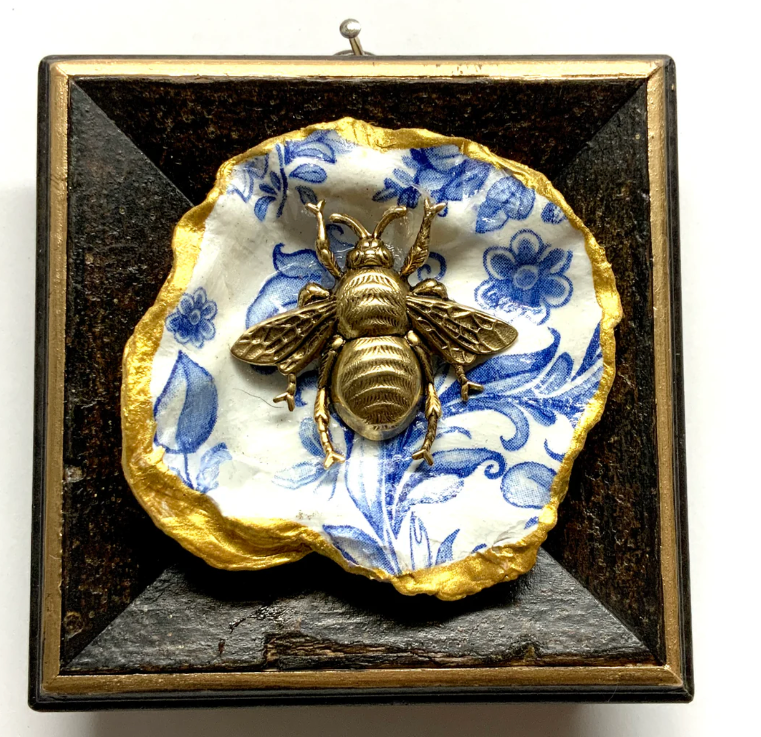 Trace Mayer uses antique frame fragments from 1860-80 to form charming and interesting shapes. In the center, various ornaments are showcased, the first of which was Napoleon's Bee. What has transpired over the years is a phenomenon anyone and everyone can get excited about and be a part of. Bees have expanded to include many other gems, including other animals, insects, and even personal items such as a medal or a unique family heirloom. Small antique objects are also showcased, including horse brass, pre-Columbian fragments, or small cameos.