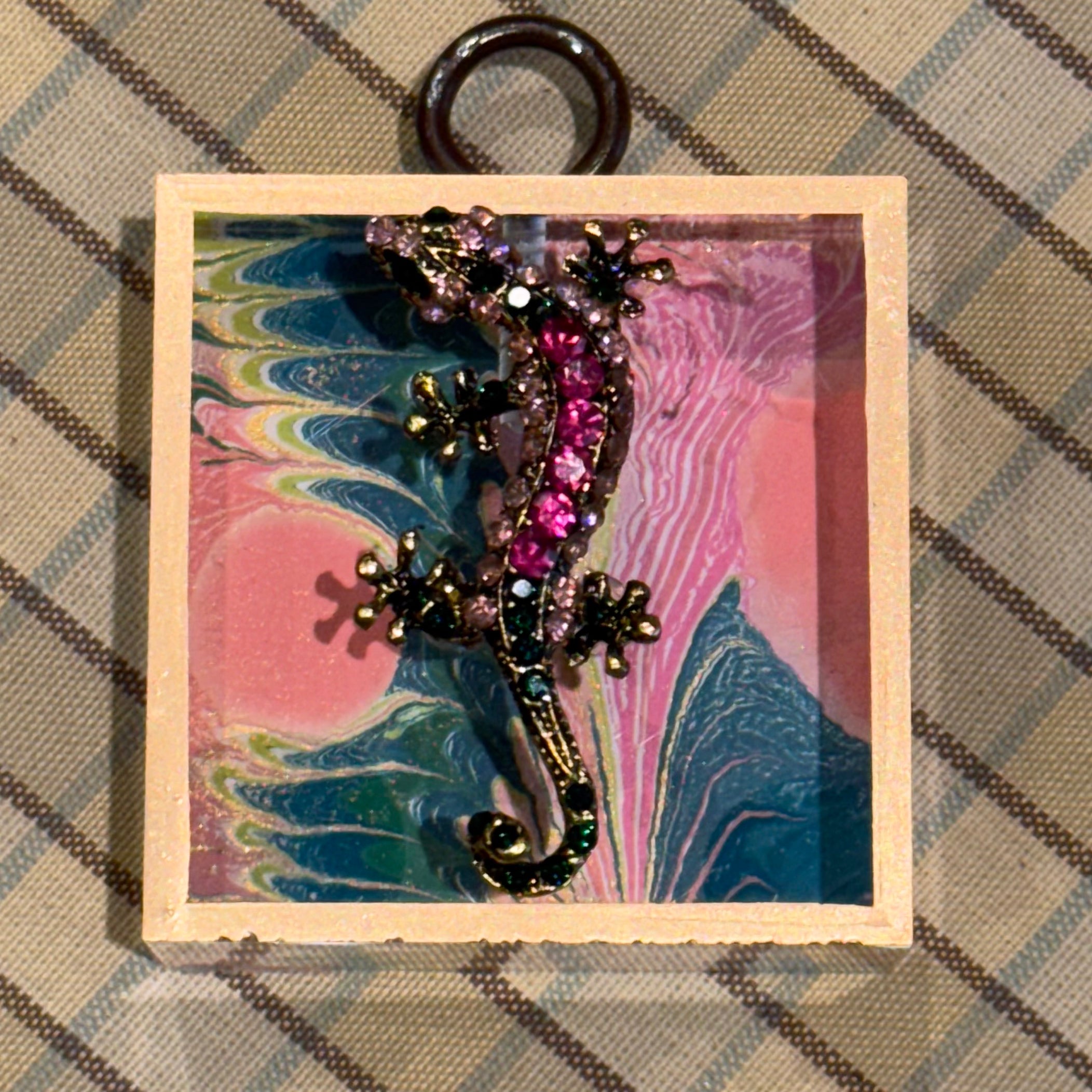Acrylic Frame with Sparkle Salamander on Marbled Paper / Slight Imperfections