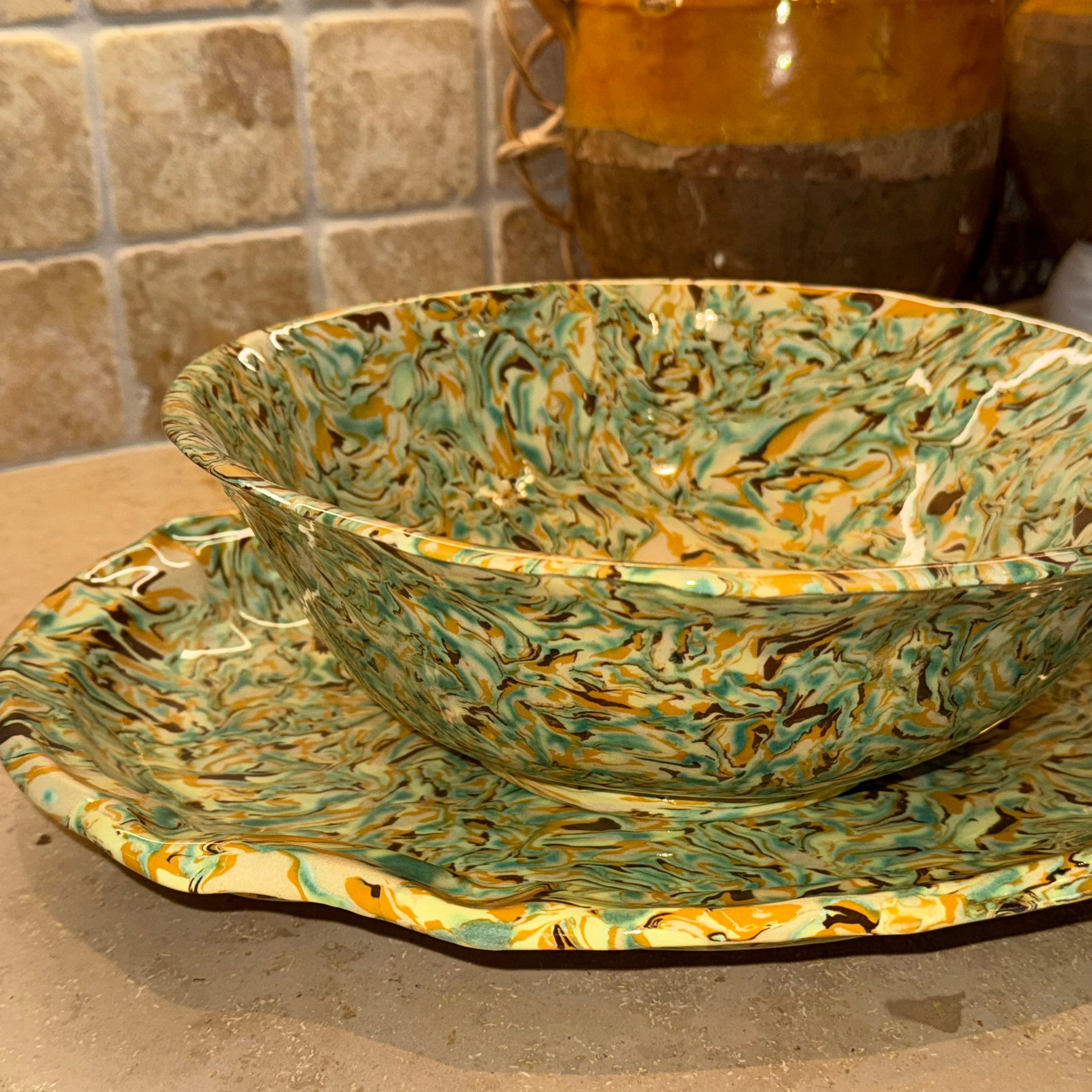 Aptware is a beautifully marbleized faience pottery, naturally inspired by the colored soils in Apt, a small town in France. Apt's mixed clay ceramics are world-renowned. I was overjoyed when I came across a skilled artisan residing in that region and discovered she is one of the last remaining masters of this art form. I am thrilled to provide access to this highly specialized and sought-after product. However, it is usually considered a very special order. Keep in mind the delivery times range anywhere from 8 weeks at certain times of the year to 8 months at other times. The images displayed under *Aptware from France* are samples of aptware I have seen when visiting the workshops. Please inquire with any questions! We often feature pieces I purchase while in Apt in the shops. However, most aptware sells very quickly, and keeping any of the traditional aptware in stock is hard.