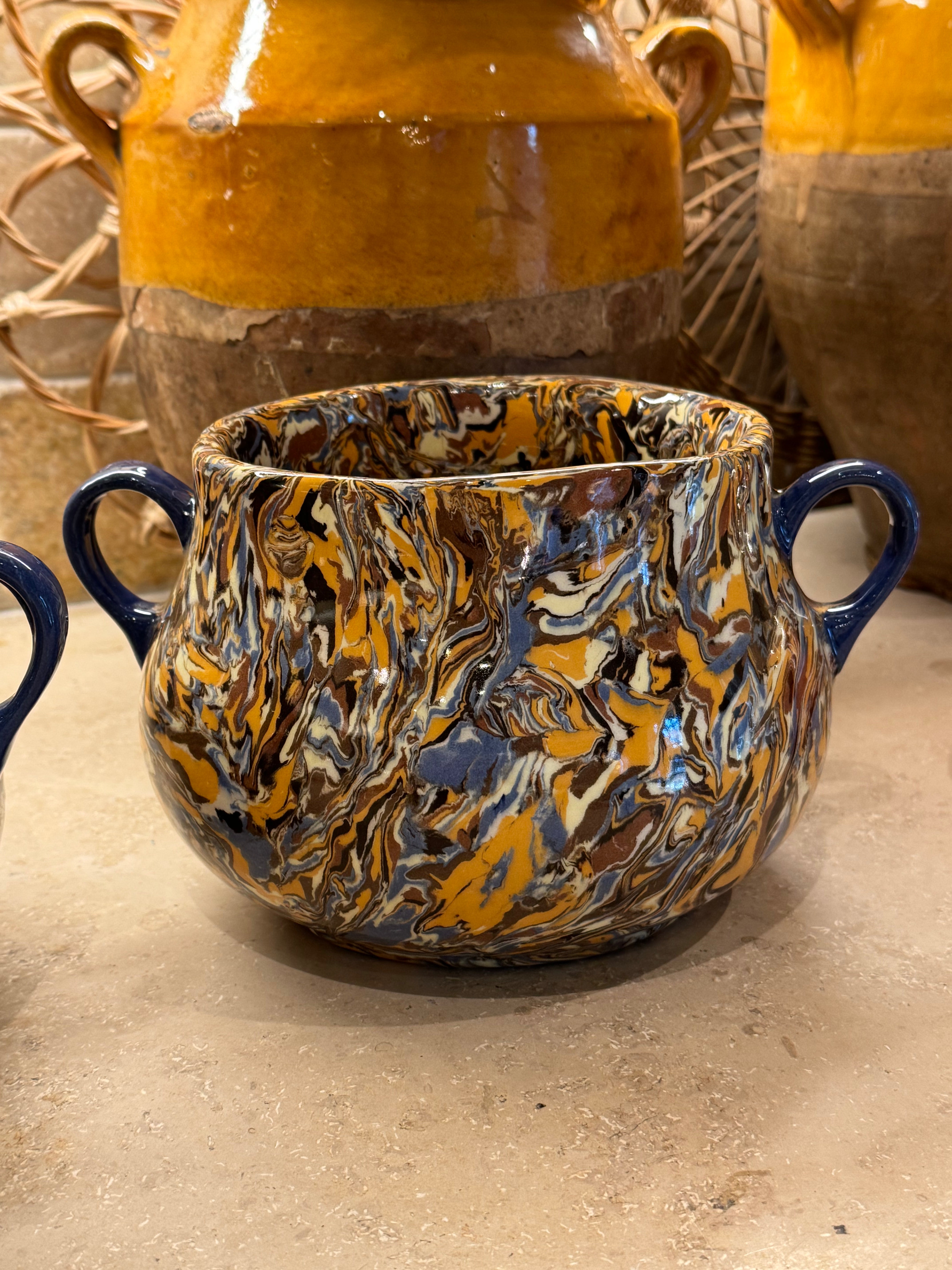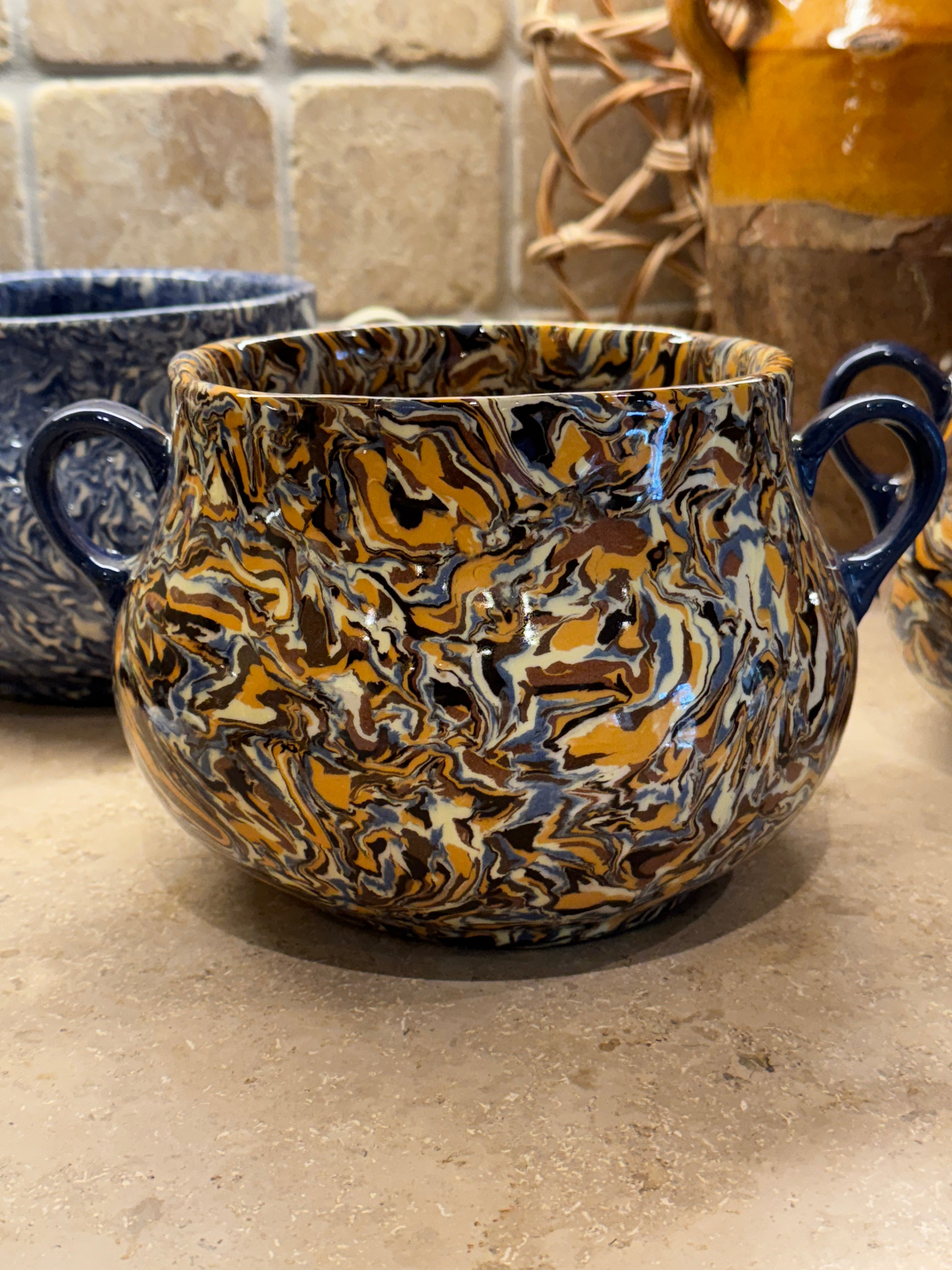 Aptware is a beautifully marbleized faience pottery, naturally inspired by the colored soils in Apt, a small town in France. Apt's mixed clay ceramics are world-renowned. I was overjoyed when I came across a skilled artisan residing in that region and discovered she is one of the last remaining masters of this art form. I am thrilled to provide access to this highly specialized and sought-after product. However, it is usually considered a very special order. Keep in mind the delivery times range anywhere from 8 weeks at certain times of the year to 8 months at other times. The images displayed under *Aptware from France* are samples of aptware I have seen when visiting the workshops. Please inquire with any questions! We often feature pieces I purchase while in Apt in the shops. However, most aptware sells very quickly, and keeping any of the traditional aptware in stock is hard.