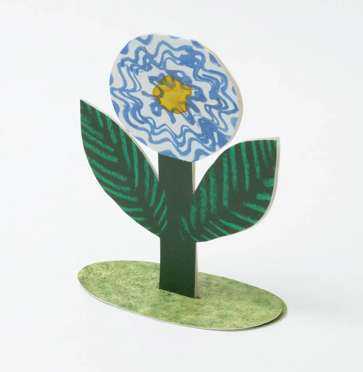 A cute blue flower to brighten your day! This beautiful blue flower card folds out to become free standing on its own grassy-looking base. Send someone special (or yourself) a flower that will last!