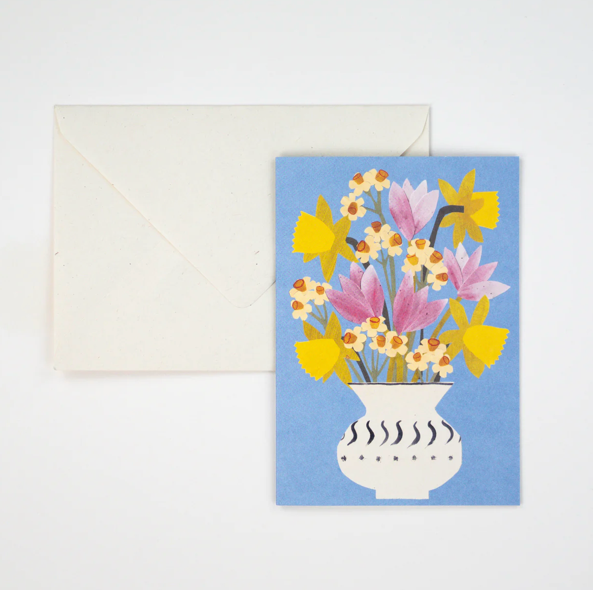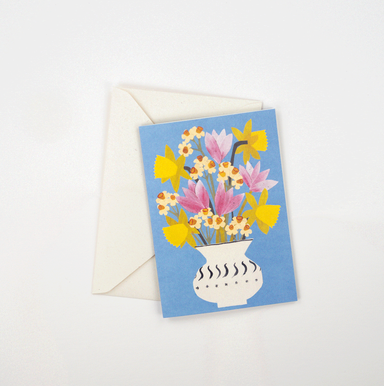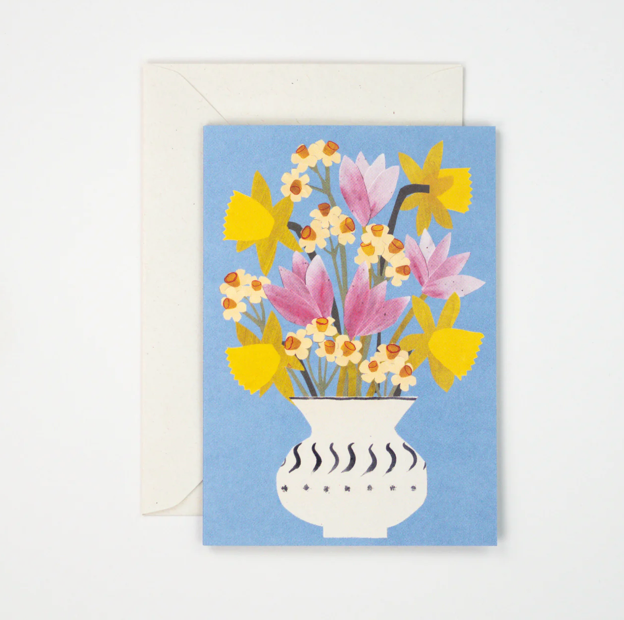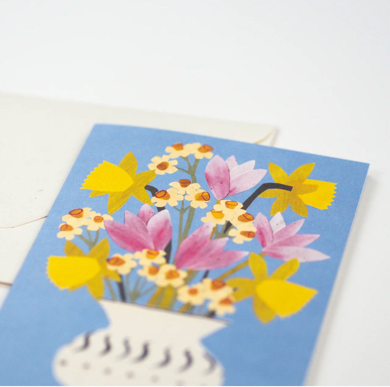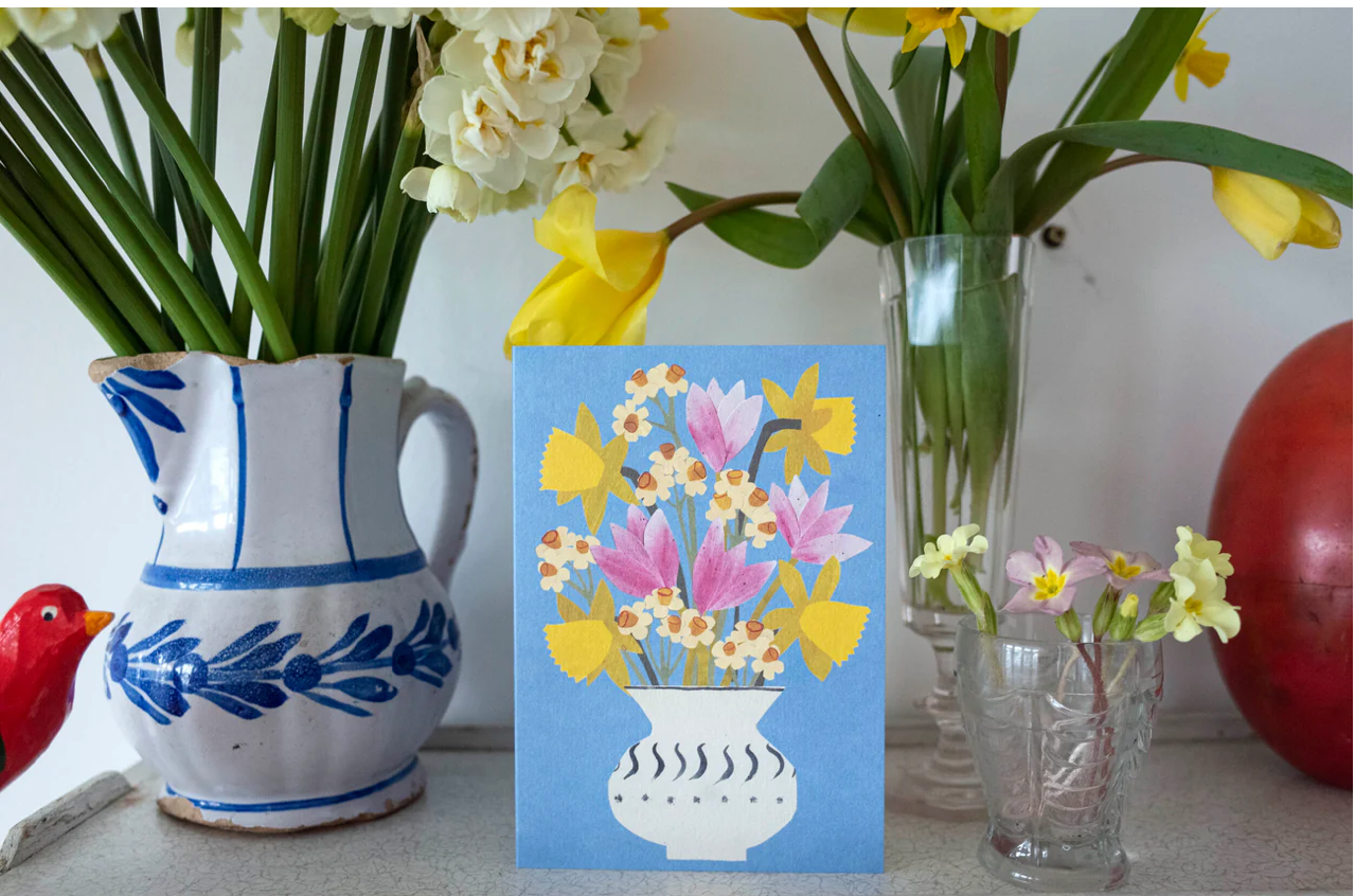 A beautiful spring flowers card featuring a bouquet with daffodils, narcissus and tulips on a cornflower blue background; hopeful and bright, to remind us of the optimism of spring.
