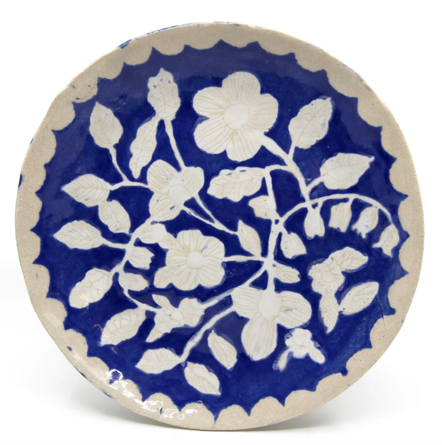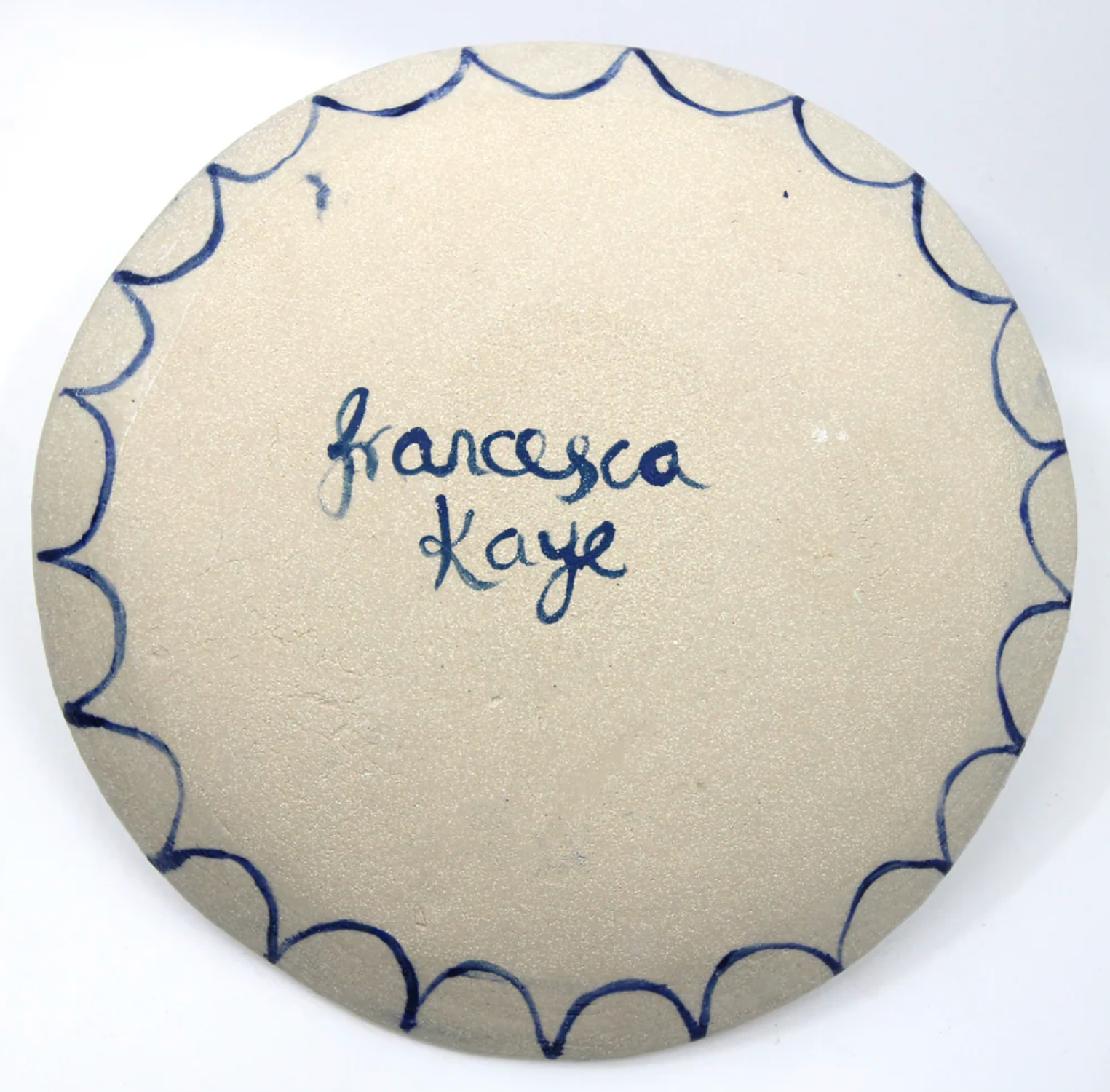This 10.25" ceramic blue floral plate by British ceramicist Francesca Kaye brings the vibrancy of French 18th-century block-printed indigo textiles to life. The energetic floral design, adorned with scalloped edges and deep borders, is both captivating on its own and stunning as part of a larger collection. Each piece is meticulously handmade, blending the beauty of tradition with a modern artistic flair. Perfect for those who appreciate unique craftsmanship and bold, decorative ceramics.