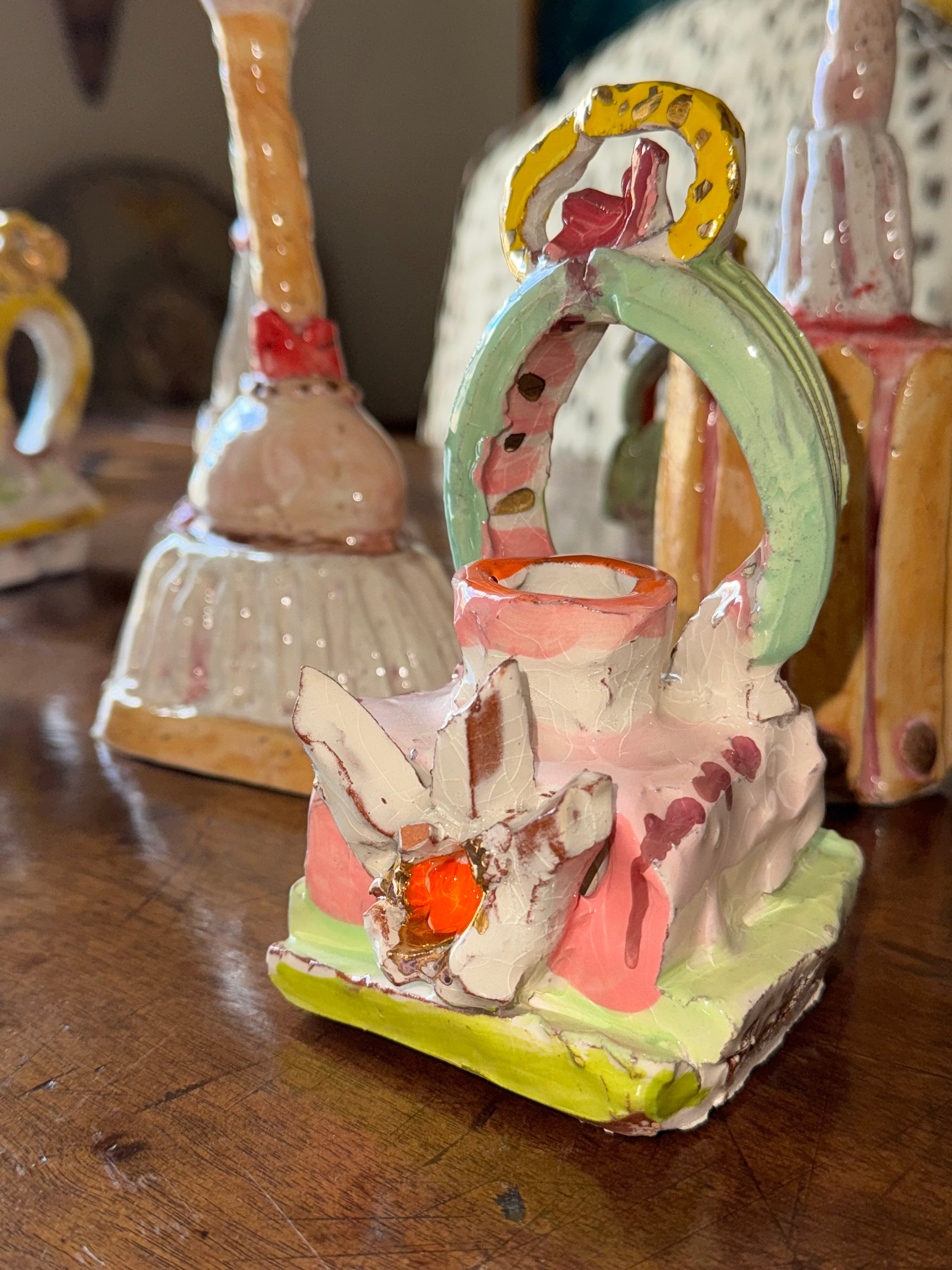 This hand-crafted ceramic votive features 24 carat gold and a charming design with butterflies... the essence of spring! The sherbet colors and darling designs are perfect to add some cheer to any space. A single candle comes with each votive, but you can experiment and try different shapes, or slip a faux or dried flower in the opening for fun!
