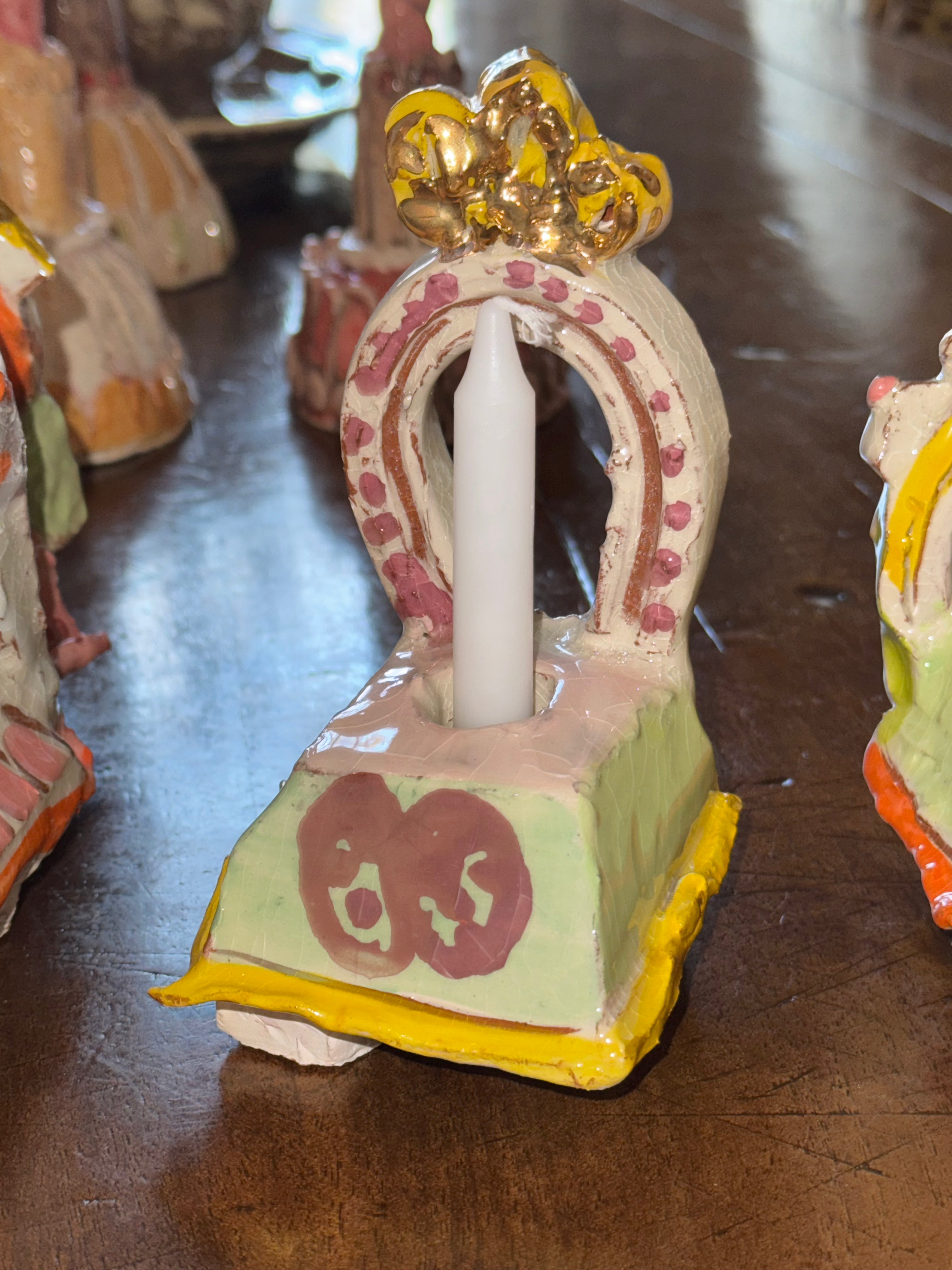 This hand-crafted ceramic votive features 24 carat gold and a charming design with butterflies... the essence of spring! The sherbet colors and darling designs are perfect to add some cheer to any space. A single candle comes with each votive, but you can experiment and try different shapes, or slip a faux or dried flower in the opening for fun!