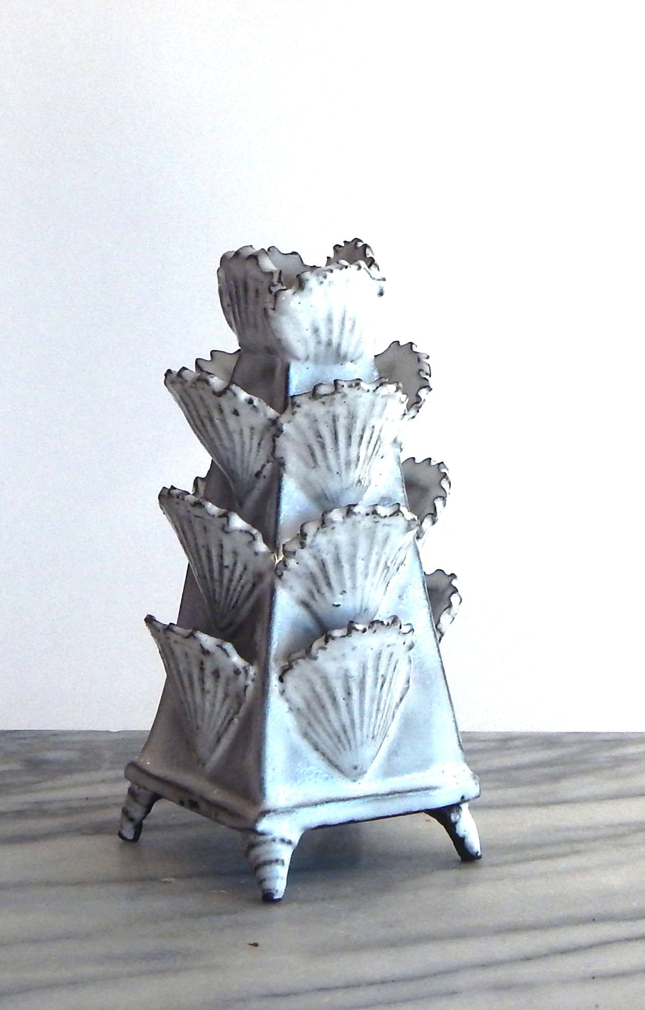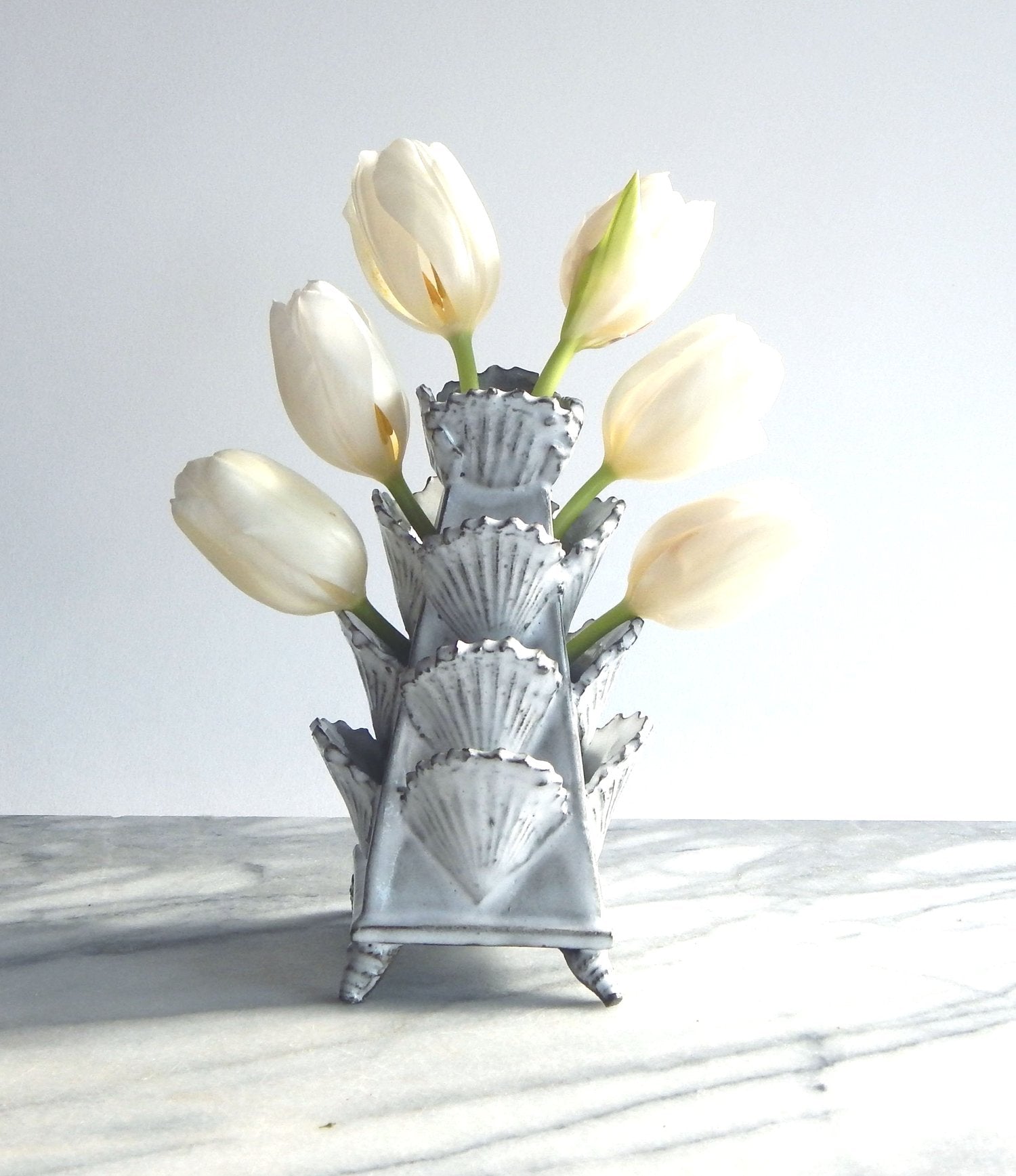 Hand built stoneware 6-inch tulipiere. White glaze over chocolate clay.