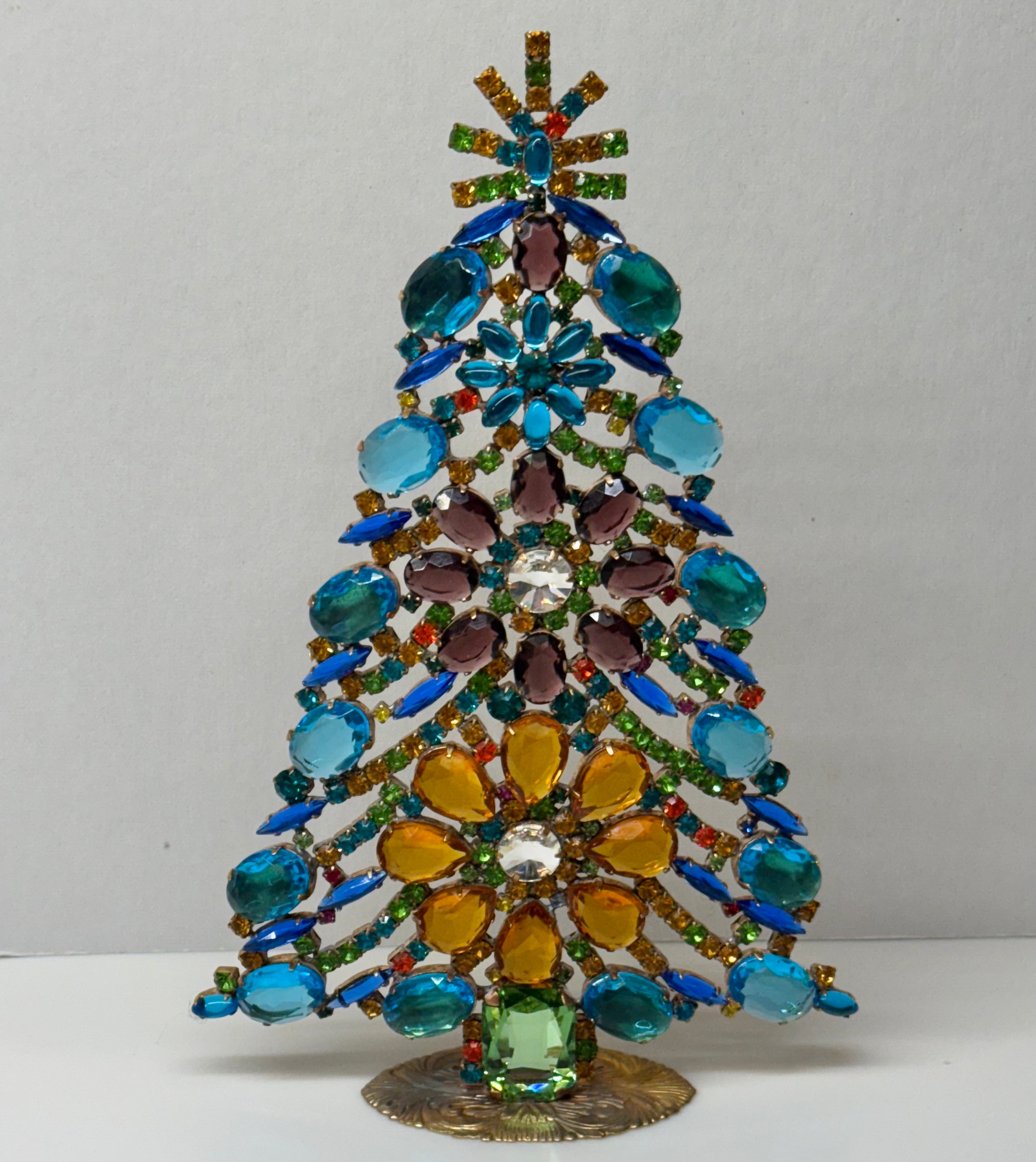 These special sparkly Czech Christmas trees showcase the elaborate designs Czechs are famous for... Between the mid-1920s and the 1950s, the jewels made in Czechoslovakia were heavily soldered with copper and pot metal, which is a mixture of semi-precious metals. That is what you see on the back of these super sparkly trees.