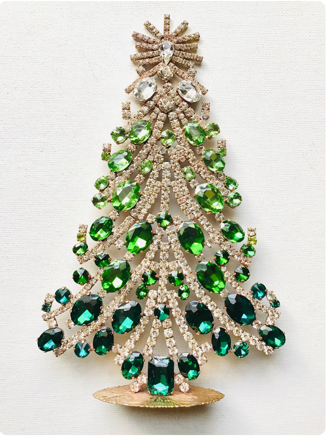 These special sparkly Czech Christmas trees showcase the elaborate designs Czechs are famous for... Between the mid-1920s and the 1950s, the jewels made in Czechoslovakia were heavily soldered with copper and pot metal, which is a mixture of semi-precious metals. That is what you see on the back of these super sparkly trees.