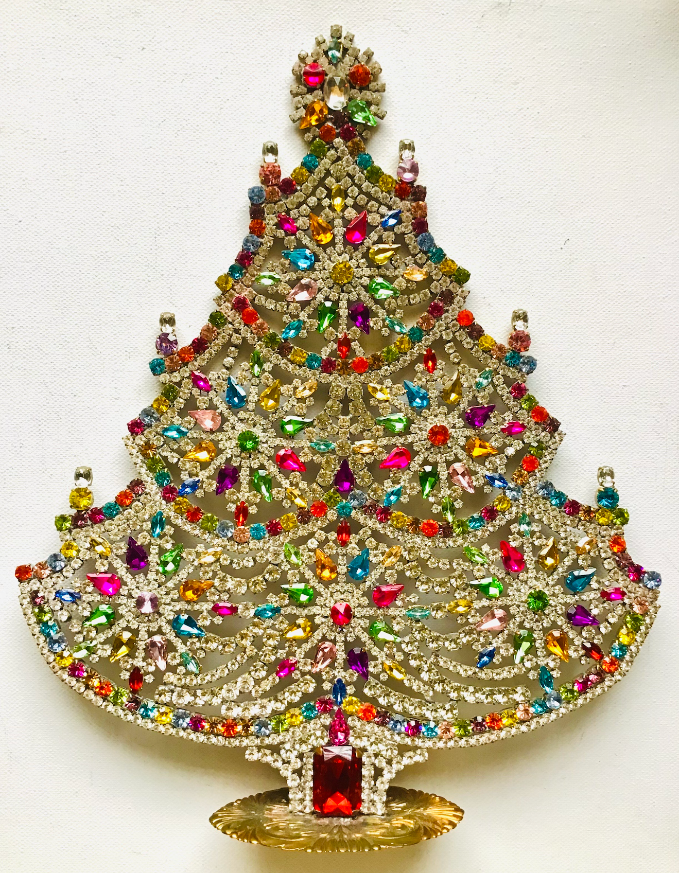 These special sparkly Czech Christmas trees showcase the elaborate designs Czechs are famous for... Between the mid-1920s and the 1950s, the jewels made in Czechoslovakia were heavily soldered with copper and pot metal, which is a mixture of semi-precious metals. That is what you see on the back of these super sparkly trees.