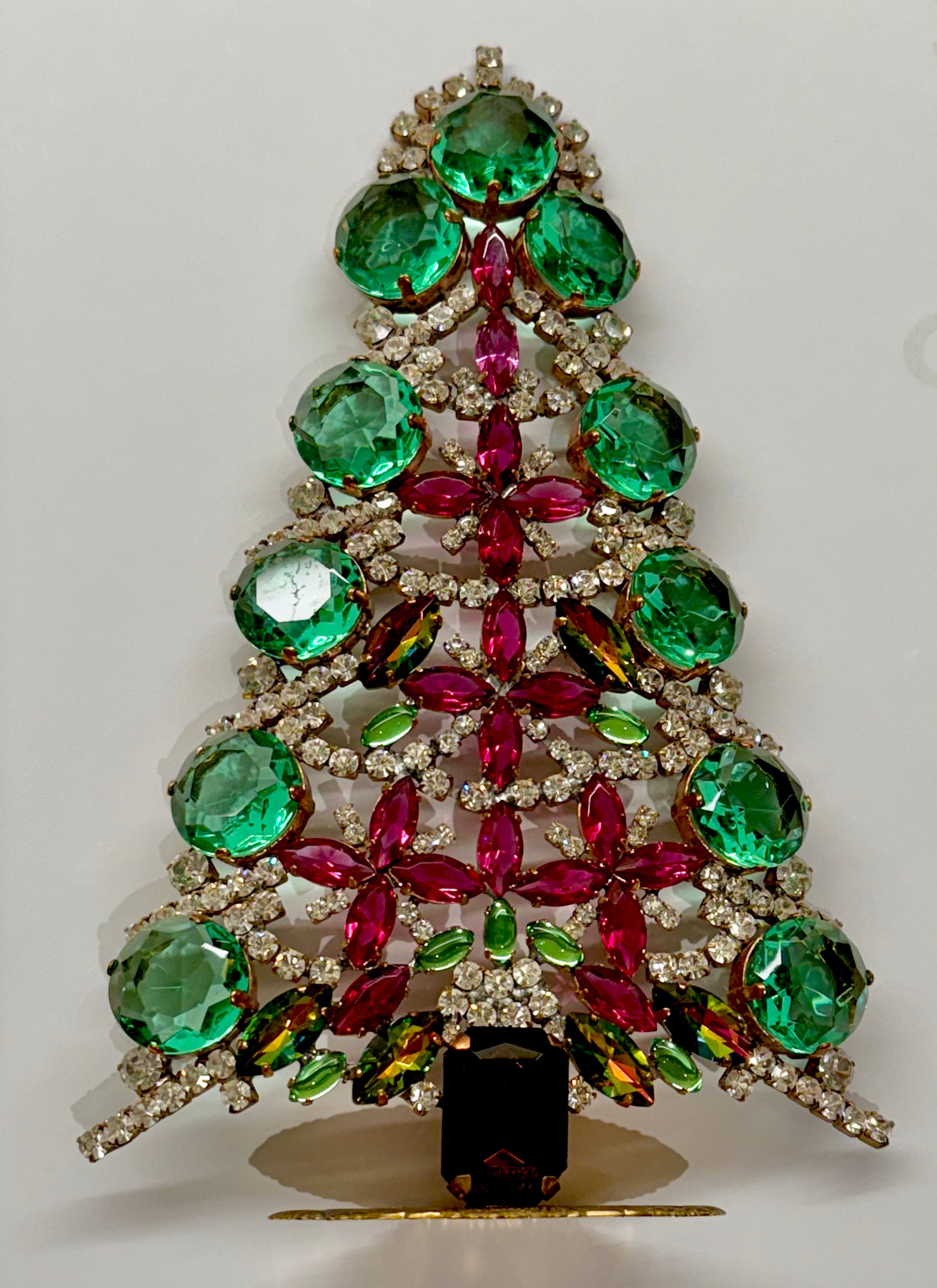 These special sparkly Czech Christmas trees showcase the elaborate designs Czechs are famous for... Between the mid-1920s and the 1950s, the jewels made in Czechoslovakia were heavily soldered with copper and pot metal, which is a mixture of semi-precious metals. That is what you see on the back of these super sparkly trees.