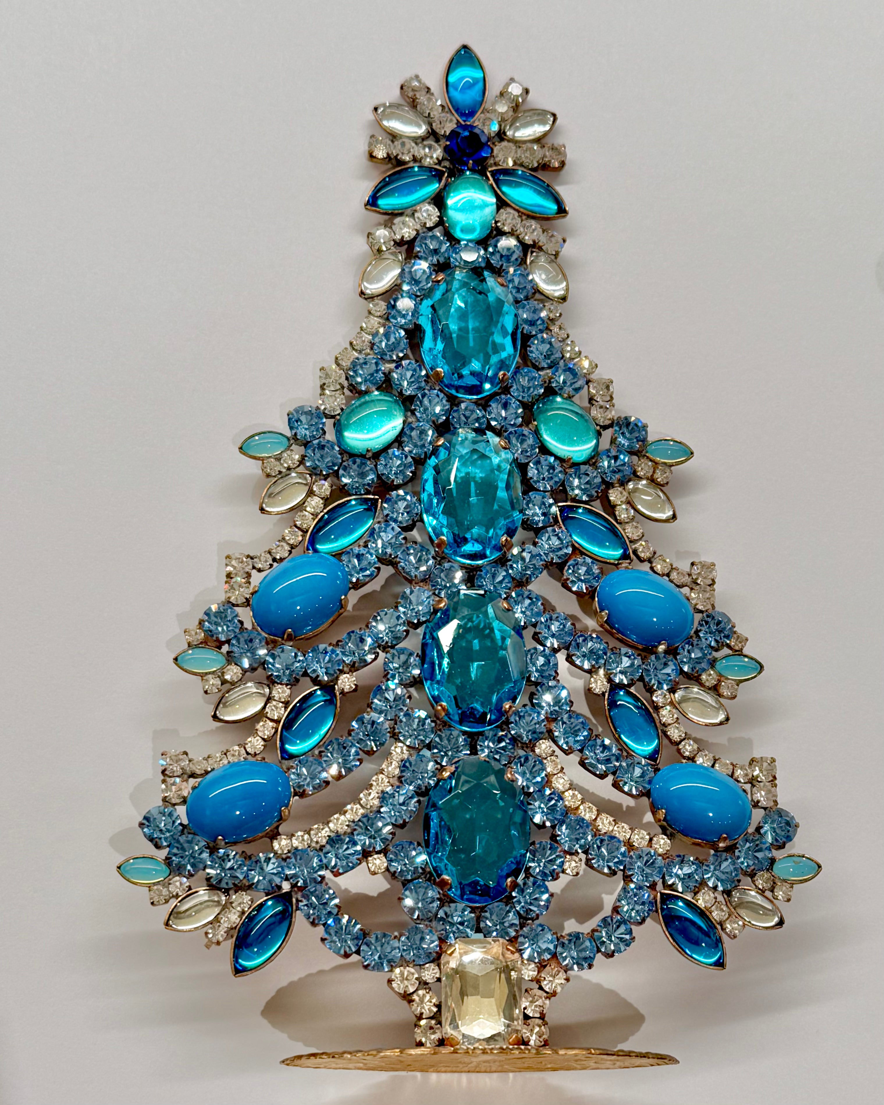 These special sparkly Czech Christmas trees showcase the elaborate designs Czechs are famous for... Between the mid-1920s and the 1950s, the jewels made in Czechoslovakia were heavily soldered with copper and pot metal, which is a mixture of semi-precious metals. That is what you see on the back of these super sparkly trees.