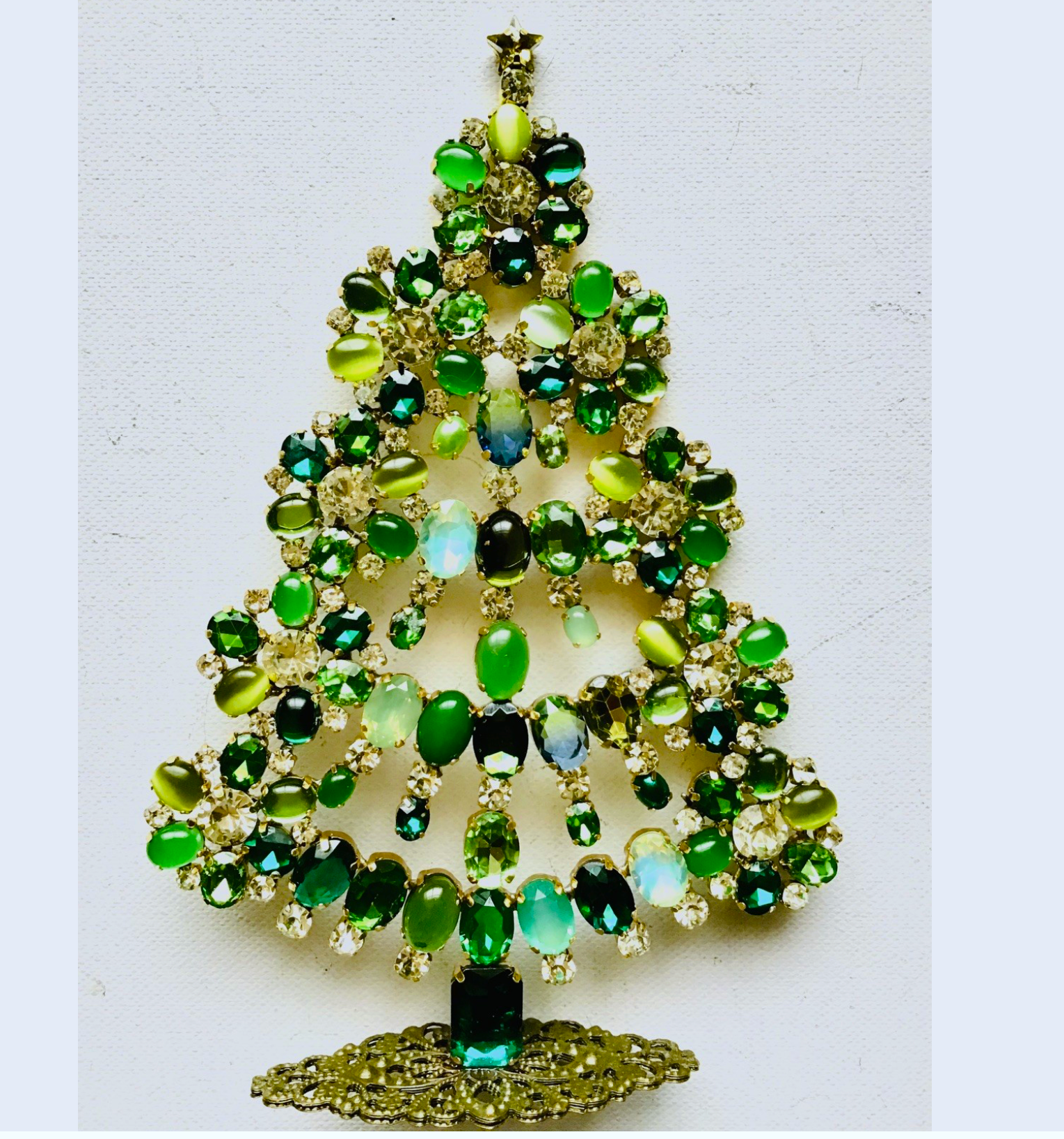 These special sparkly Czech Christmas trees showcase the elaborate designs Czechs are famous for... Between the mid-1920s and the 1950s, the jewels made in Czechoslovakia were heavily soldered with copper and pot metal, which is a mixture of semi-precious metals. That is what you see on the back of these super sparkly trees.