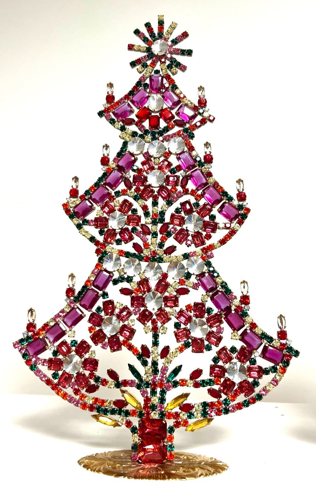 These special sparkly Czech Christmas trees showcase the elaborate designs Czechs are famous for... Between the mid-1920s and the 1950s, the jewels made in Czechoslovakia were heavily soldered with copper and pot metal, which is a mixture of semi-precious metals. That is what you see on the back of these super sparkly trees.