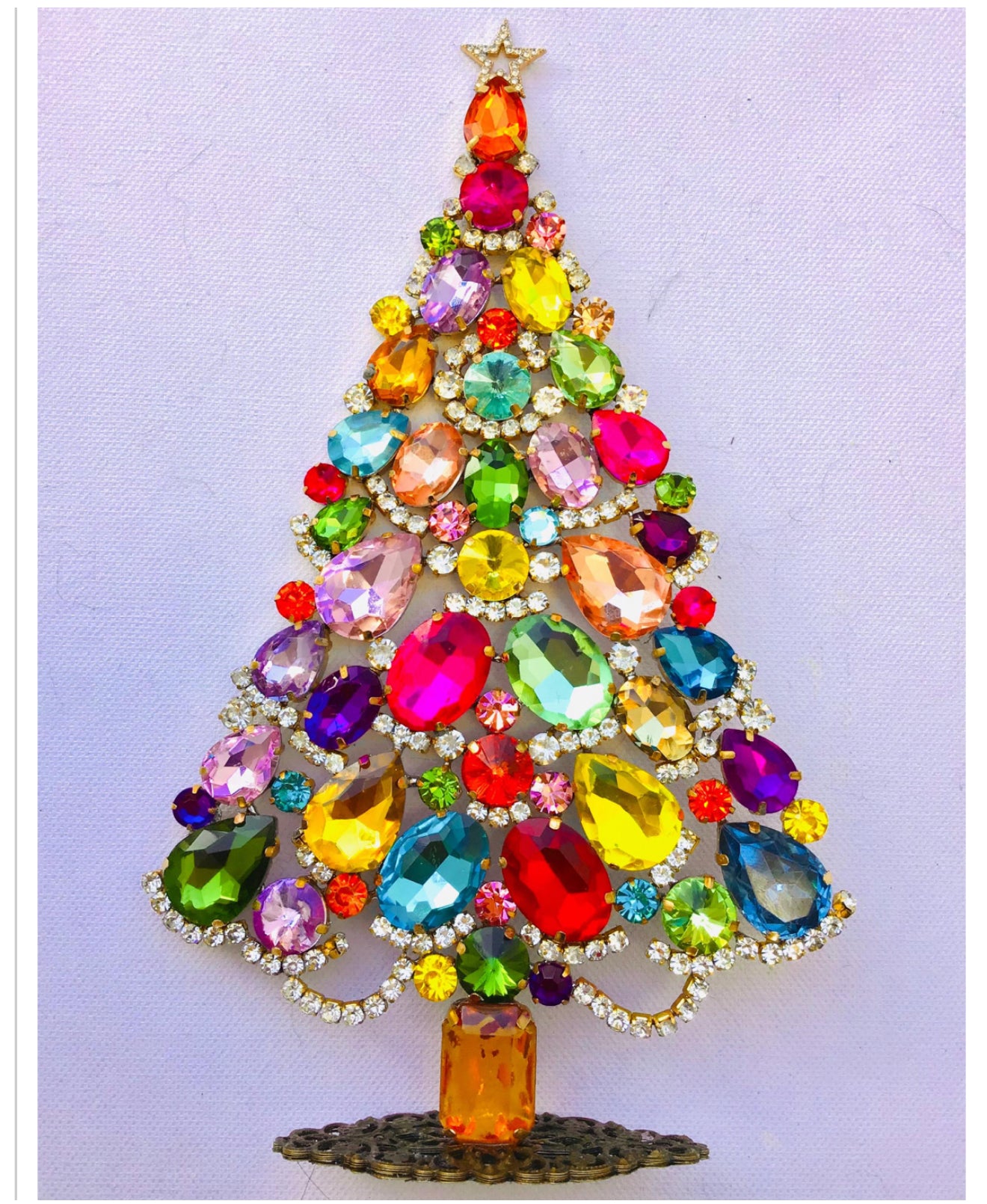 These special sparkly Czech Christmas trees showcase the elaborate designs Czechs are famous for... Between the mid-1920s and the 1950s, the jewels made in Czechoslovakia were heavily soldered with copper and pot metal, which is a mixture of semi-precious metals. That is what you see on the back of these super sparkly trees.