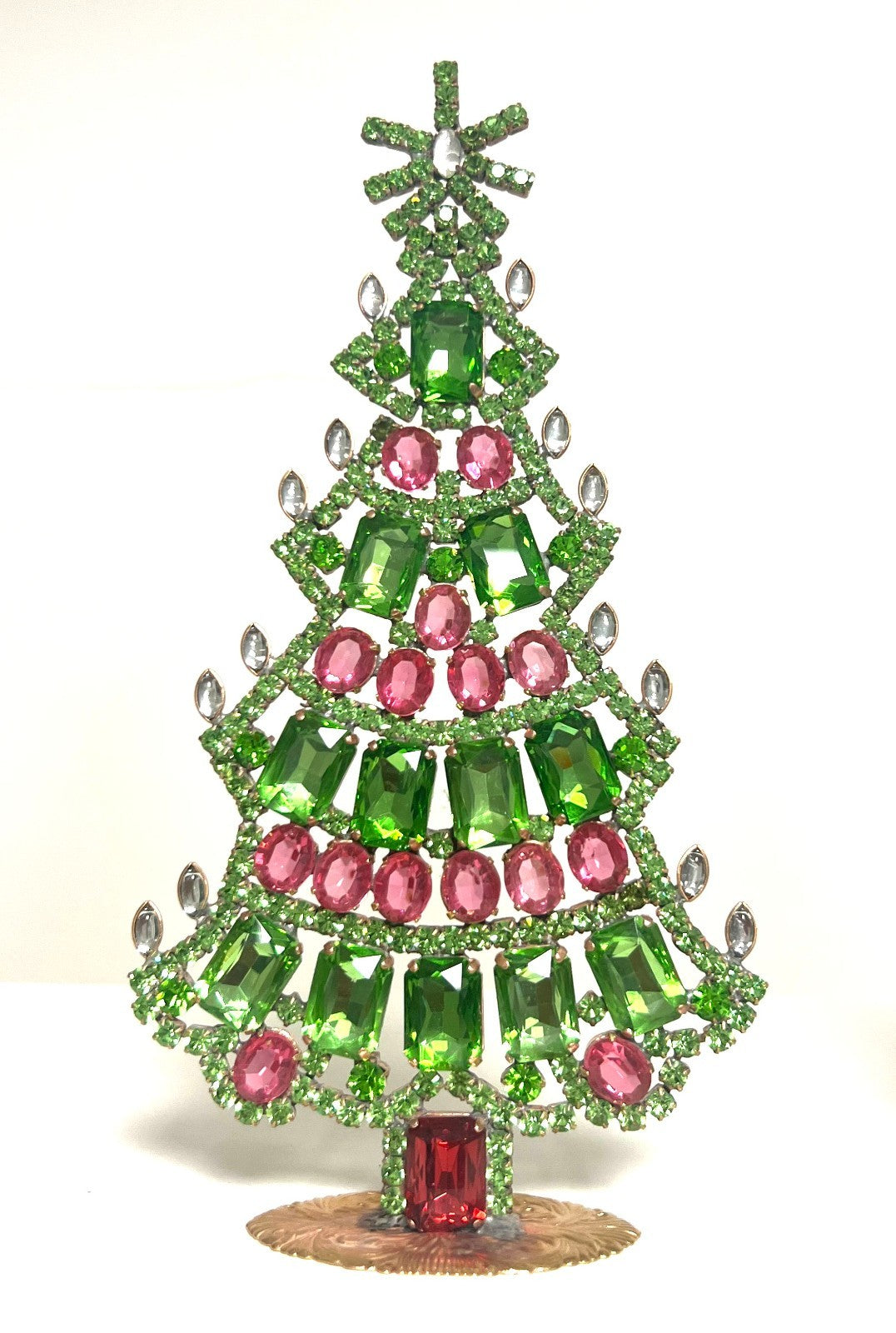 These special sparkly Czech Christmas trees showcase the elaborate designs Czechs are famous for... Between the mid-1920s and the 1950s, the jewels made in Czechoslovakia were heavily soldered with copper and pot metal, which is a mixture of semi-precious metals. That is what you see on the back of these super sparkly trees.