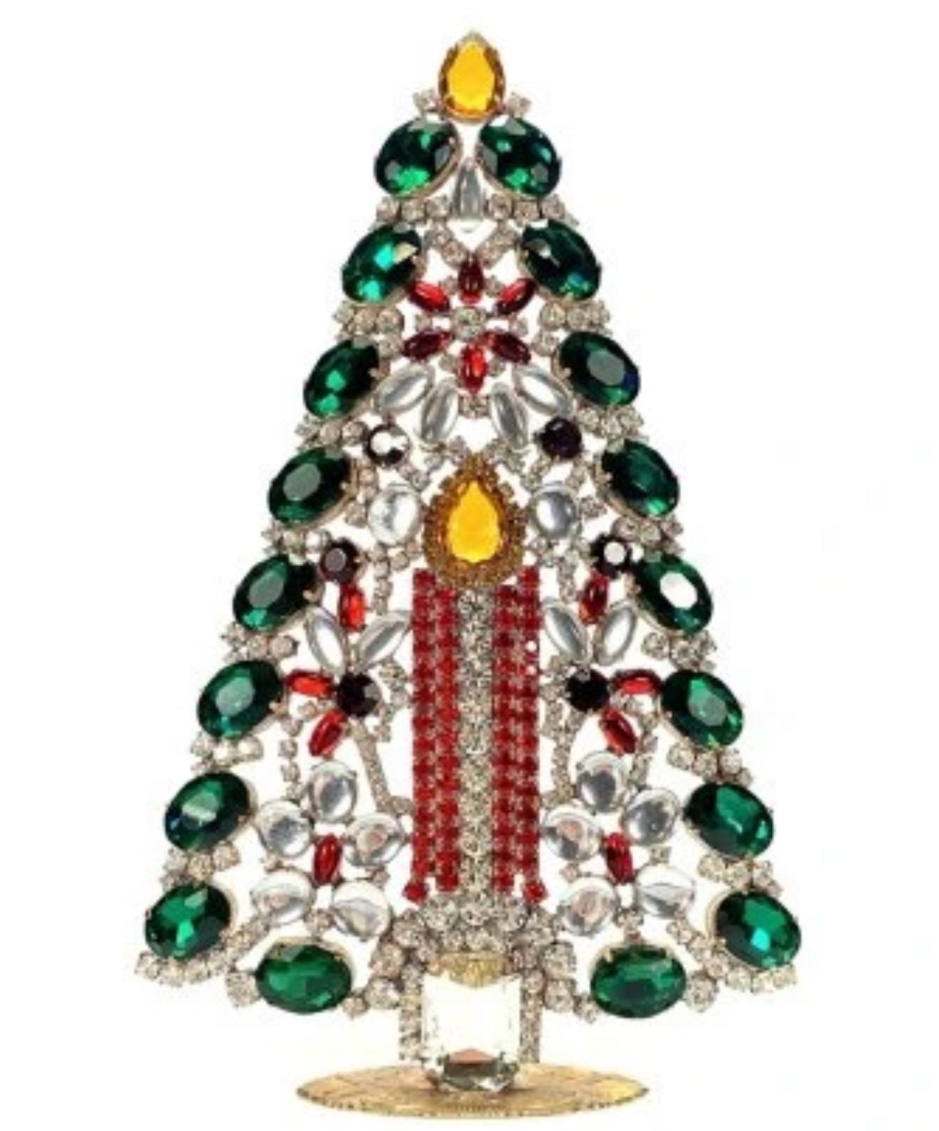 These special sparkly Czech Christmas trees showcase the elaborate designs Czechs are famous for... Between the mid-1920s and the 1950s, the jewels made in Czechoslovakia were heavily soldered with copper and pot metal, which is a mixture of semi-precious metals. That is what you see on the back of these super sparkly trees.
