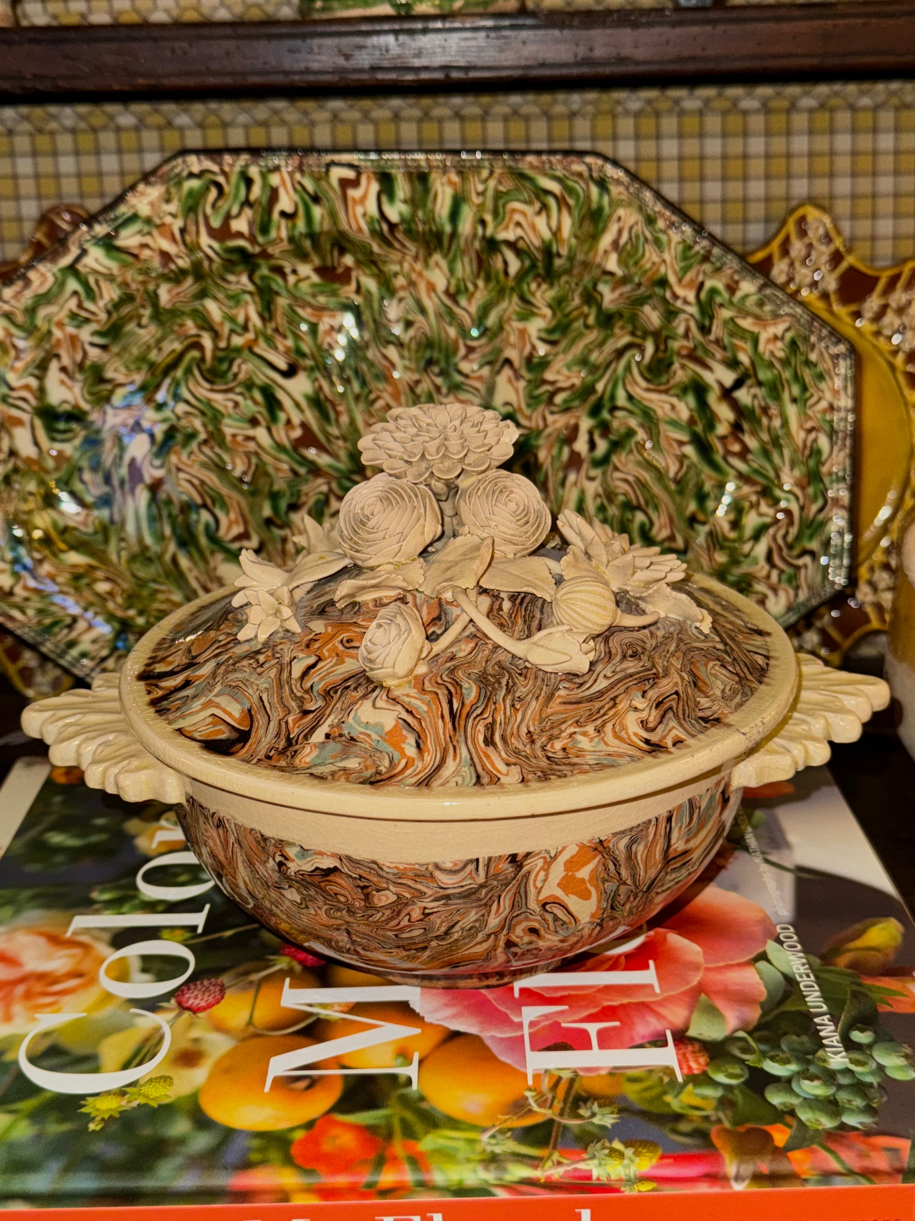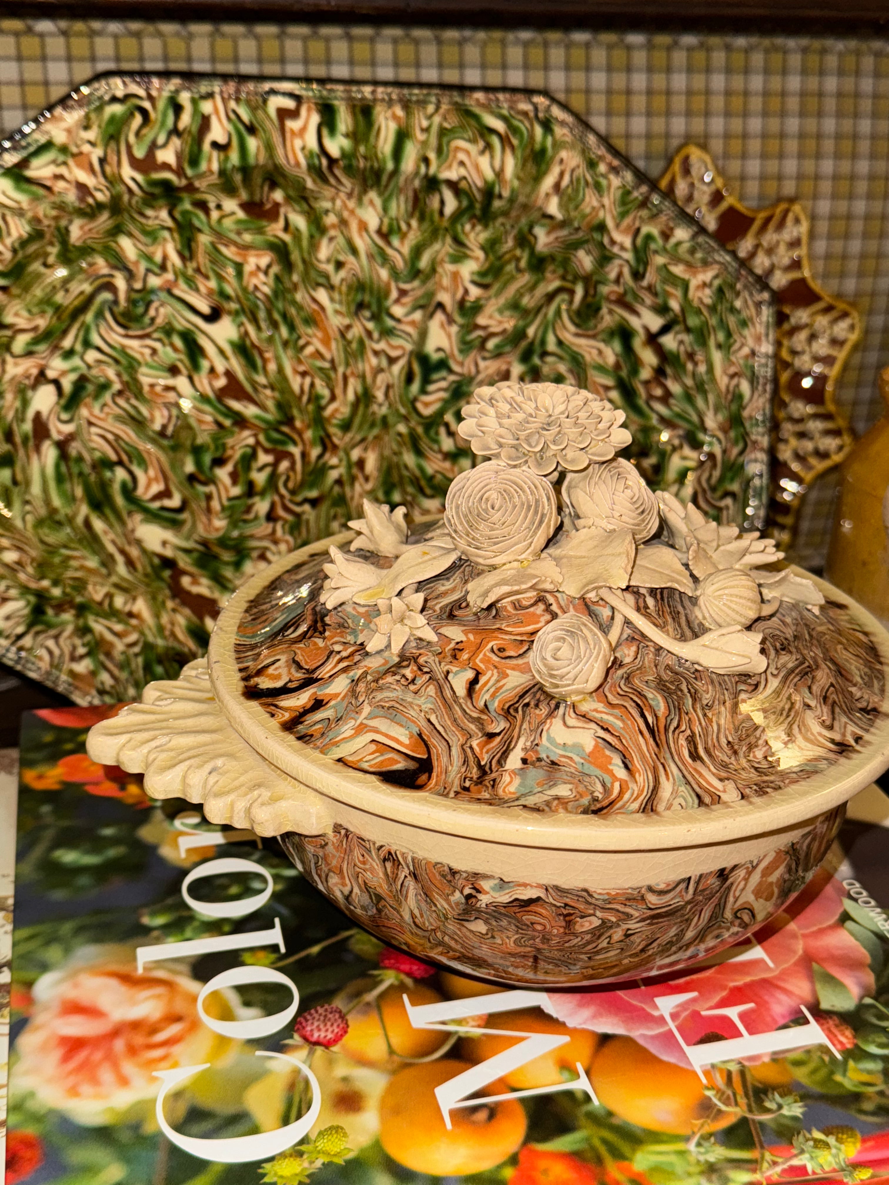 A stunning vintage aptware tureen featuring gorgeous floral design. Signed and dated on the bottom: Bernard 1943.