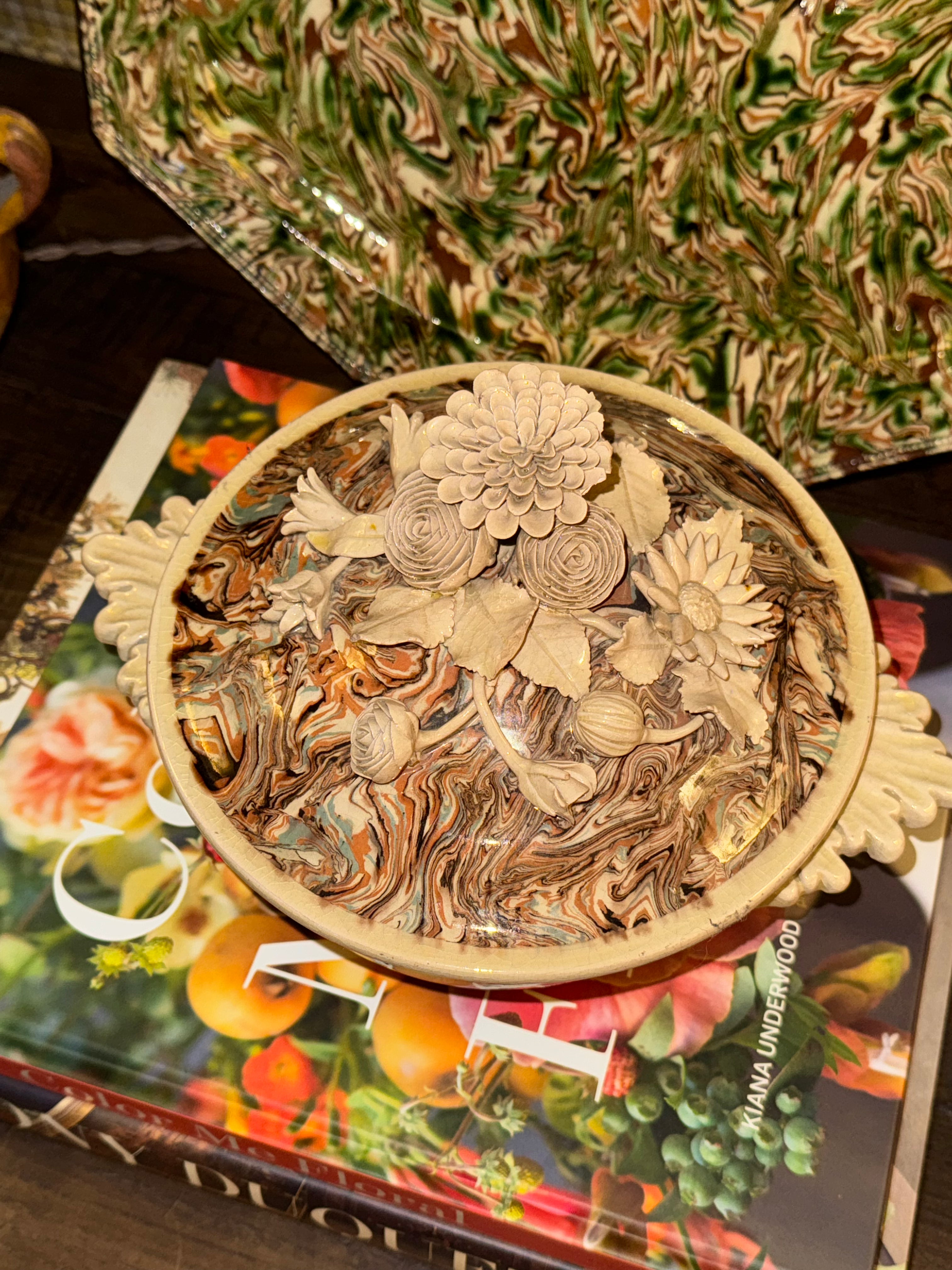 Aptware is a beautifully marbleized faience pottery, naturally inspired by the colored soils in Apt, a small town in France. Apt's mixed clay ceramics are world-renowned. I was overjoyed when I came across a skilled artisan residing in that region and discovered she is one of the last remaining masters of this art form. I am thrilled to provide access to this highly specialized and sought-after product. However, it is usually considered a very special order. Keep in mind the delivery times range anywhere from 8 weeks at certain times of the year to 8 months at other times. The images displayed under *Aptware from France* are samples of aptware I have seen when visiting the workshops. Please inquire with any questions! We often feature pieces I purchase while in Apt in the shops. However, most aptware sells very quickly, and keeping any of the traditional aptware in stock is hard.