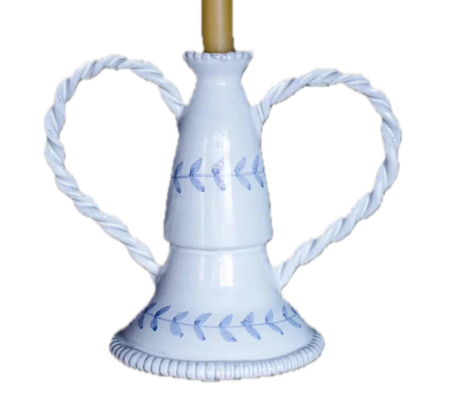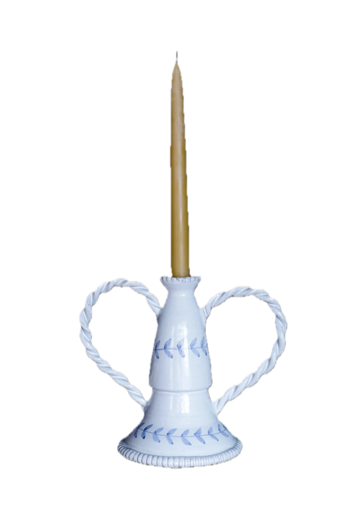 Elegant, hand-thrown candlesticks by Emily Mitchell. Hand-painted with cobalt oxide, with a white gloss glaze and white slip decoration, inspired by early delftware ceramics.