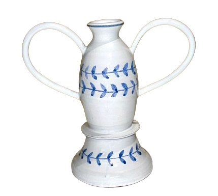 Elegant, hand-thrown candlesticks by Emily Mitchell. Hand-painted with cobalt oxide, with a white gloss glaze and white slip decoration, inspired by early delftware ceramics.