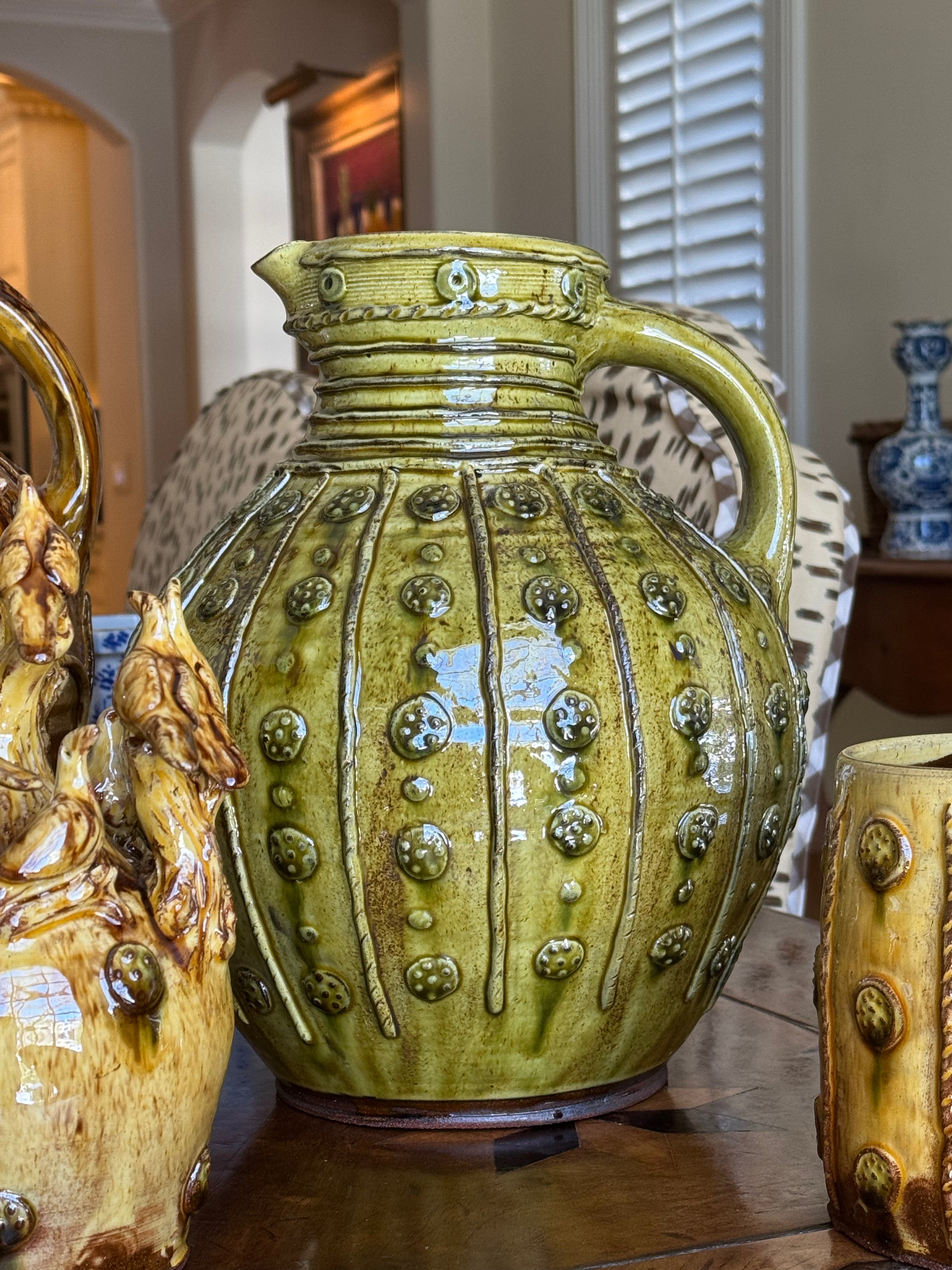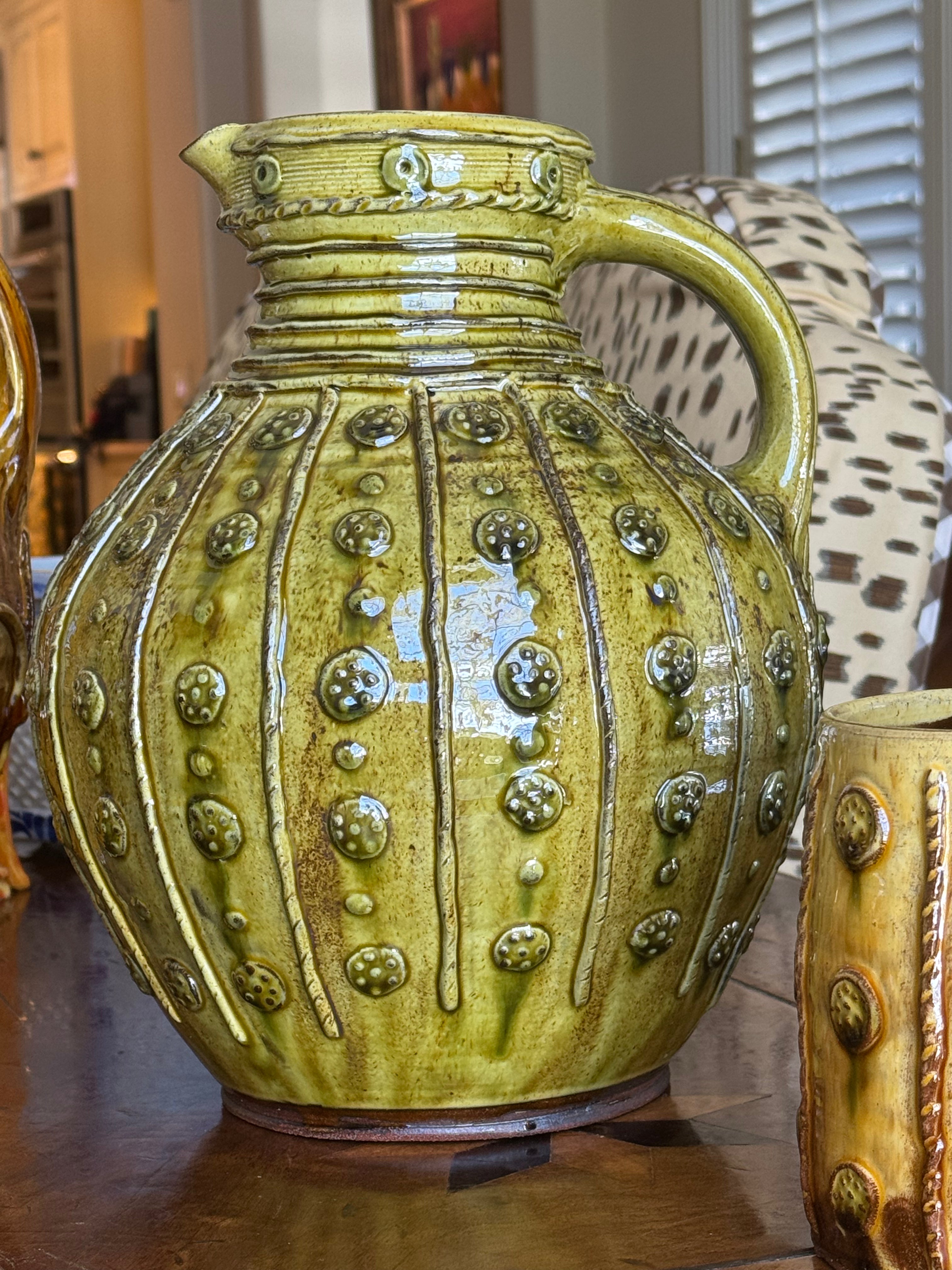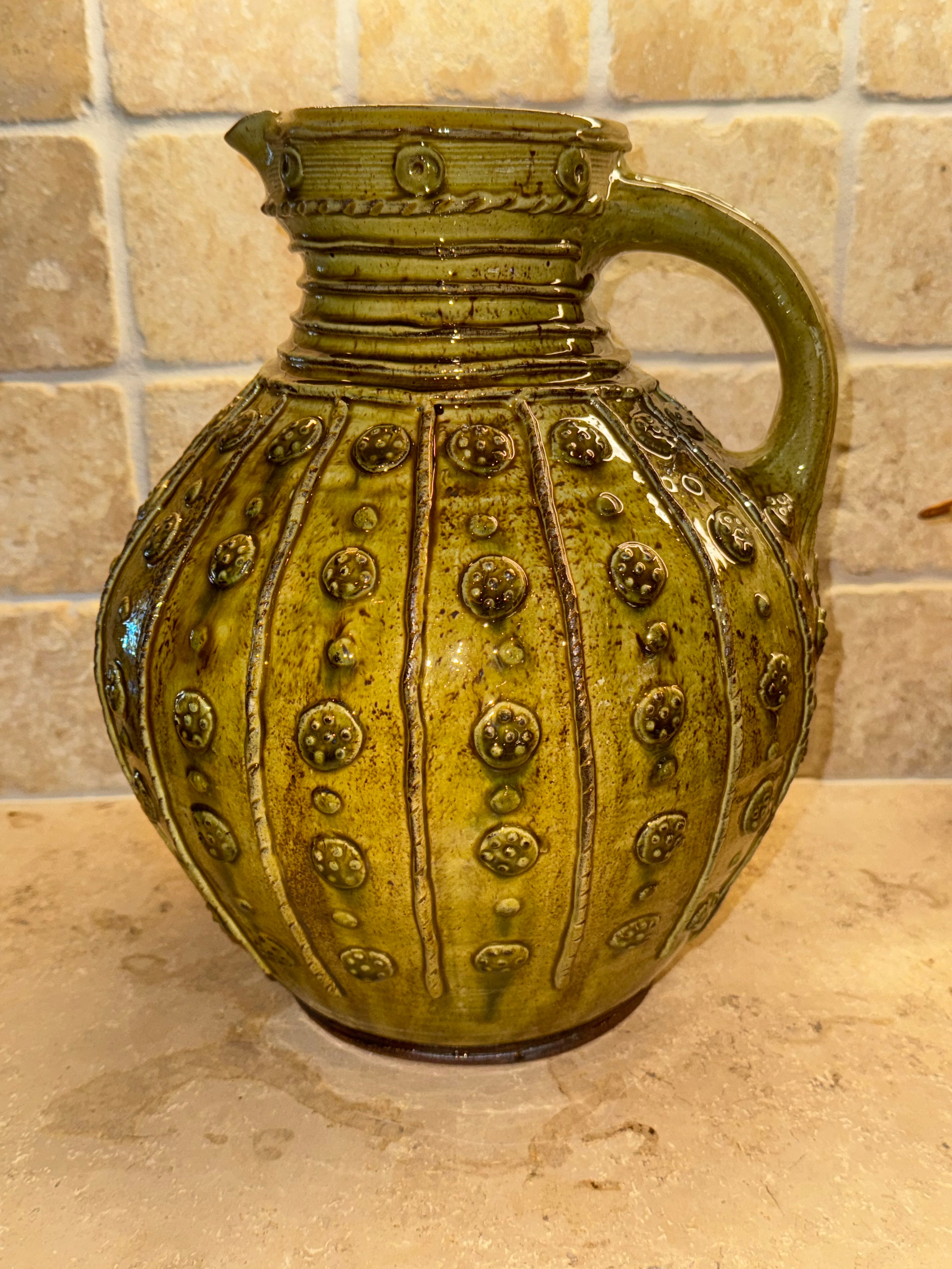 A round bellied appliqué jug with inspiration taken from Medieval pottery. The whole pot is finished in a beautiful green. It is quite heavy!