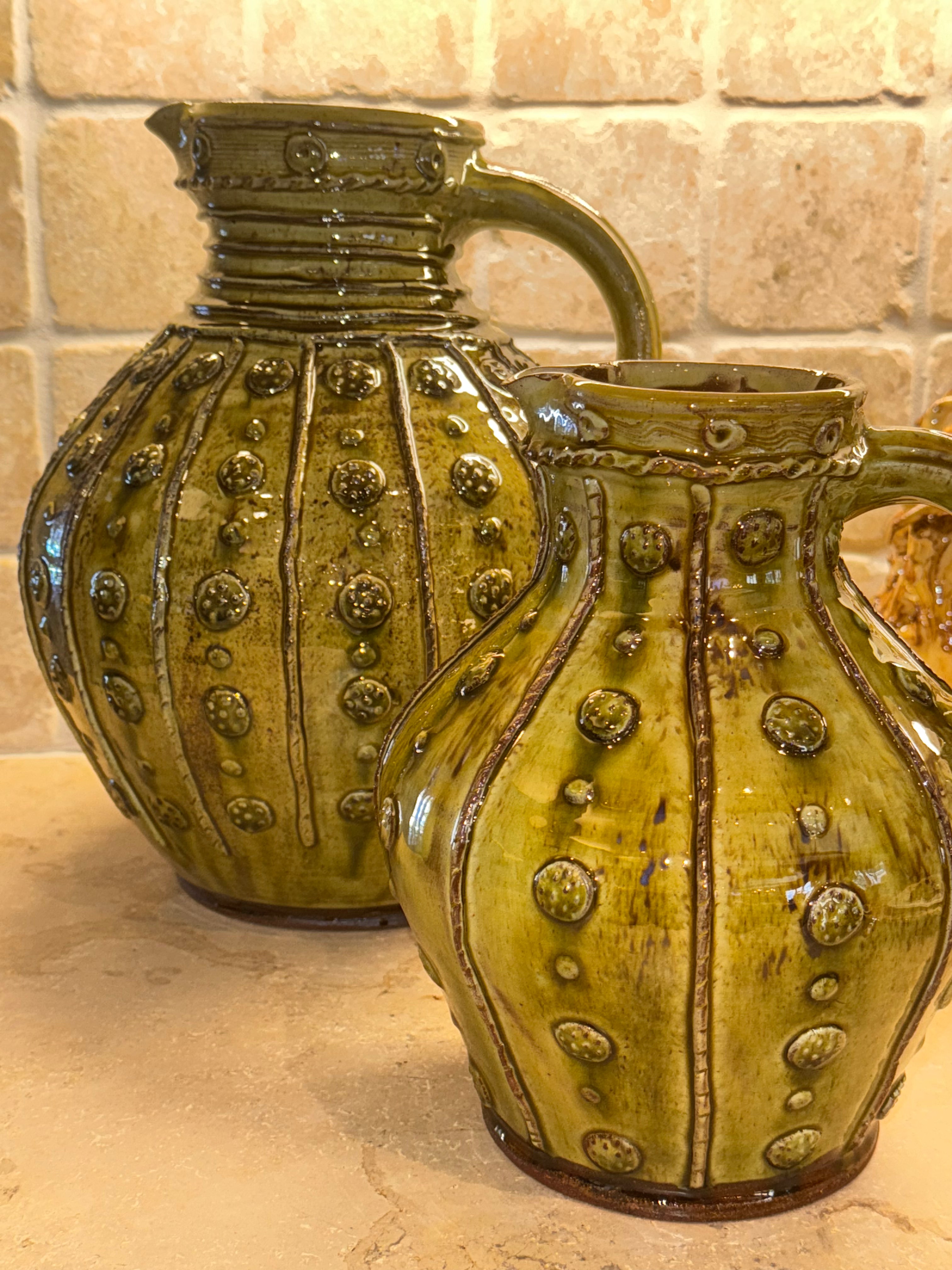 A medium sized, gently bellied appliqué jug with appliqué sprigs and ribs in a spring green. Beautiful paired with the larger version.