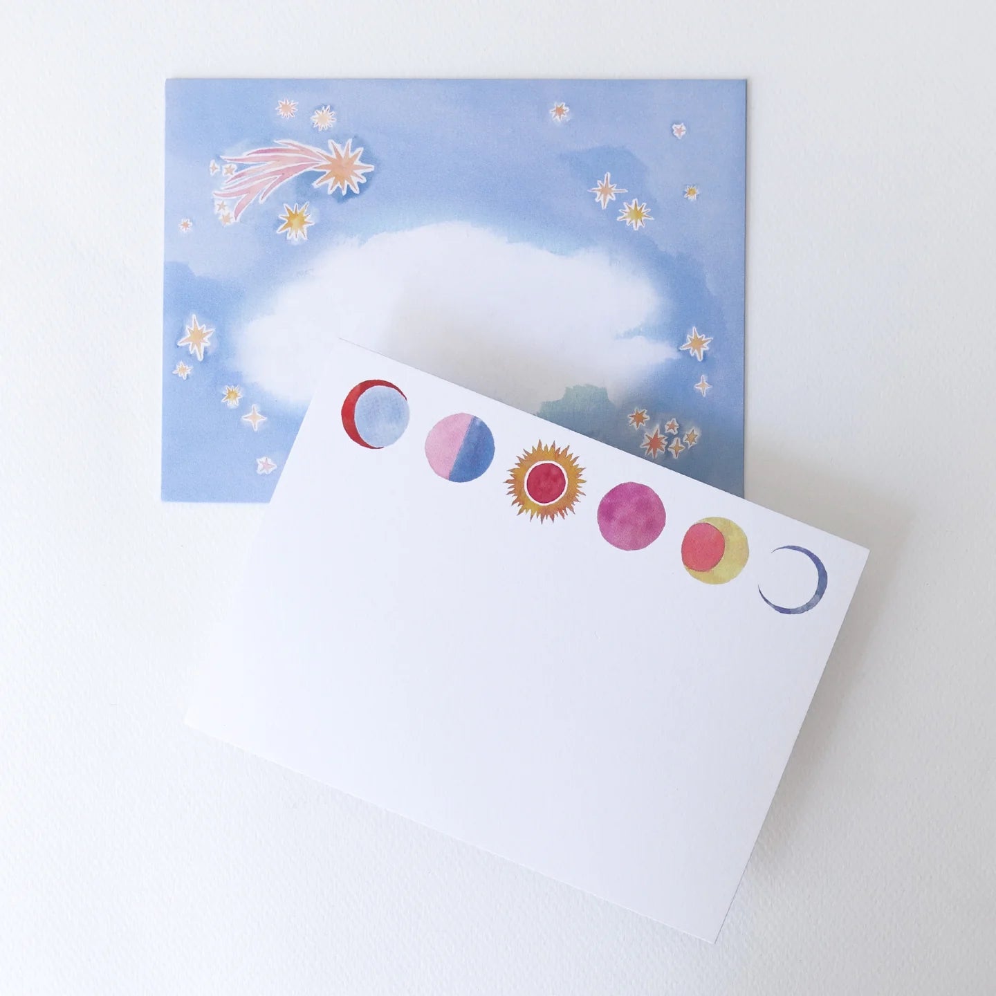 The notecards feature sun and moon phases painted by Happy Menocal and printed on luxurious two-ply paper with edges gilded in rose gold foil. The envelopes feature a custom flap shape with celestial illustration inside and out.