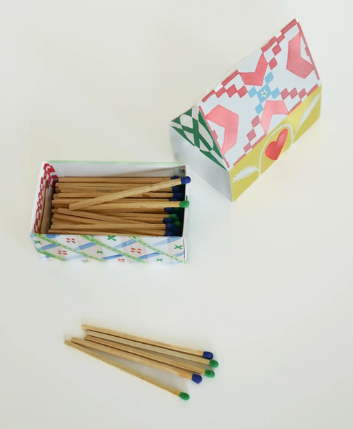 The sliding drawer holds 100 4" colorful matches. Whether they are on your mantle, the back of your toilet, residing on your bedside, or given as the perfect gift, House Matches are at home wherever you place them!