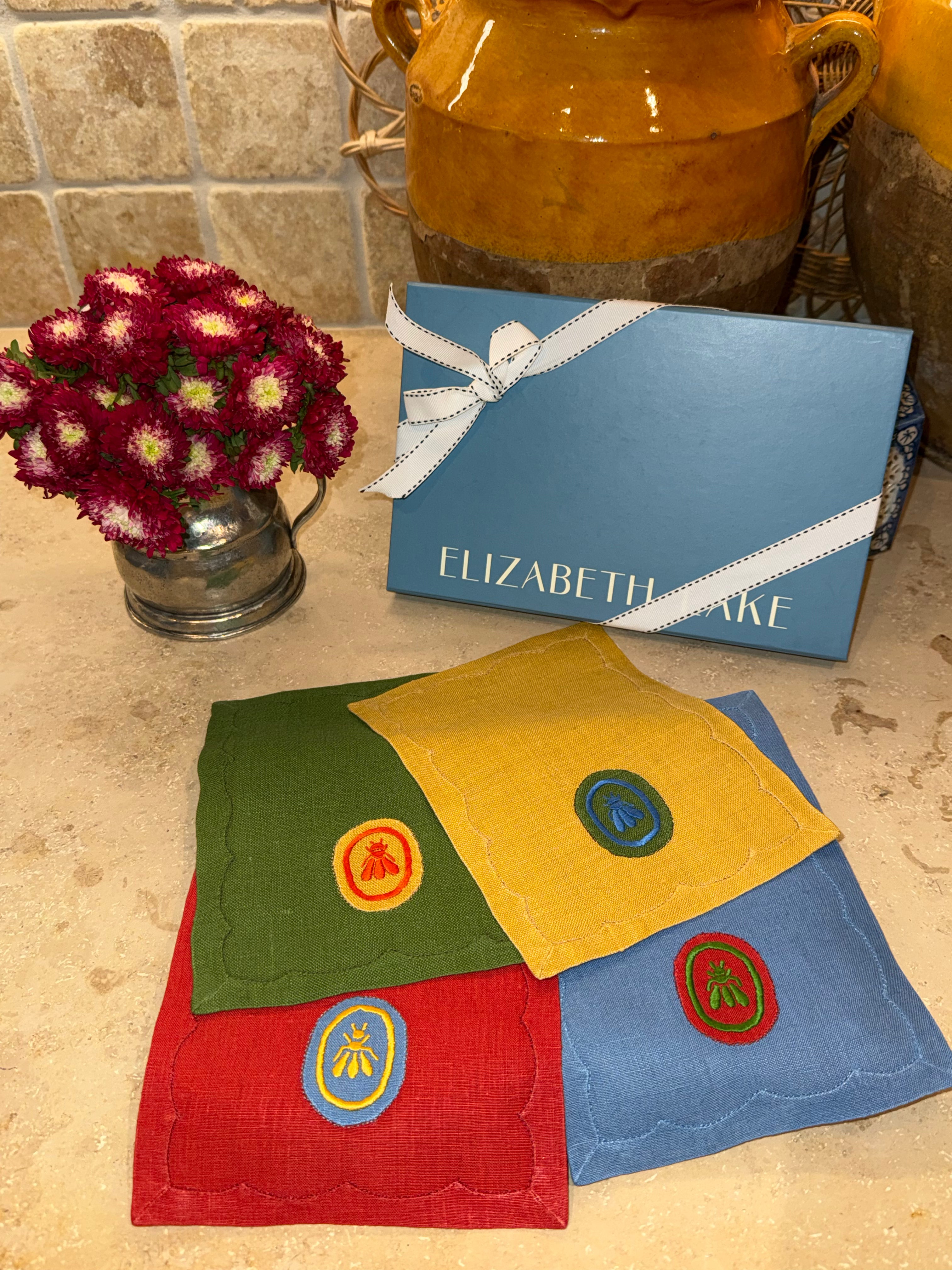 Linen cocktail napkins feature hand-stitched scallop borders and crafted on a medium weight linen featuring embroidered bee intaglios.