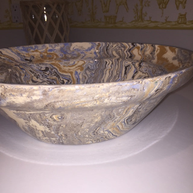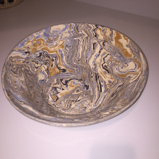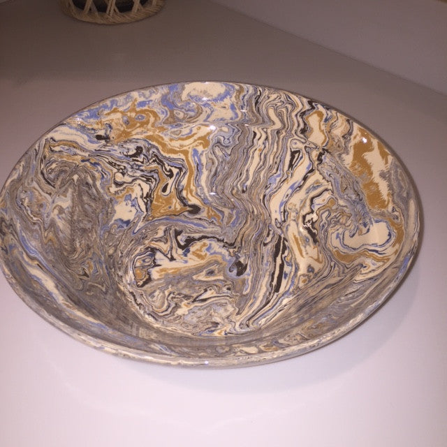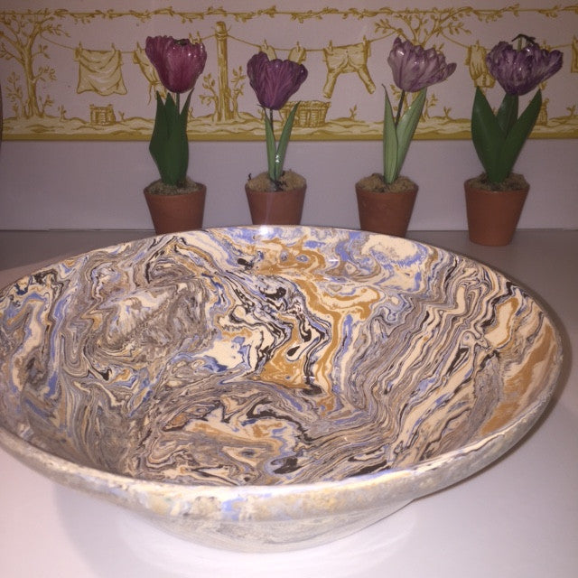 This Marbleware Bowl in French Blue, Mustard, Cream, and Brown is a true work of art. Handcrafted in France, its vibrant color palette and stunning marbled finish make it a standout piece for any collection. Perfect for serving or display, the bowl measures 12" in diameter and stands 3.75" high. Whether you're adding to your existing Marbleware collection or starting a new one, this beautiful French-made bowl will take your breath away and elevate your home decor with its timeless elegance.