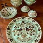 Birds, flowers and a heart adorn this lovely platter in green and browns.