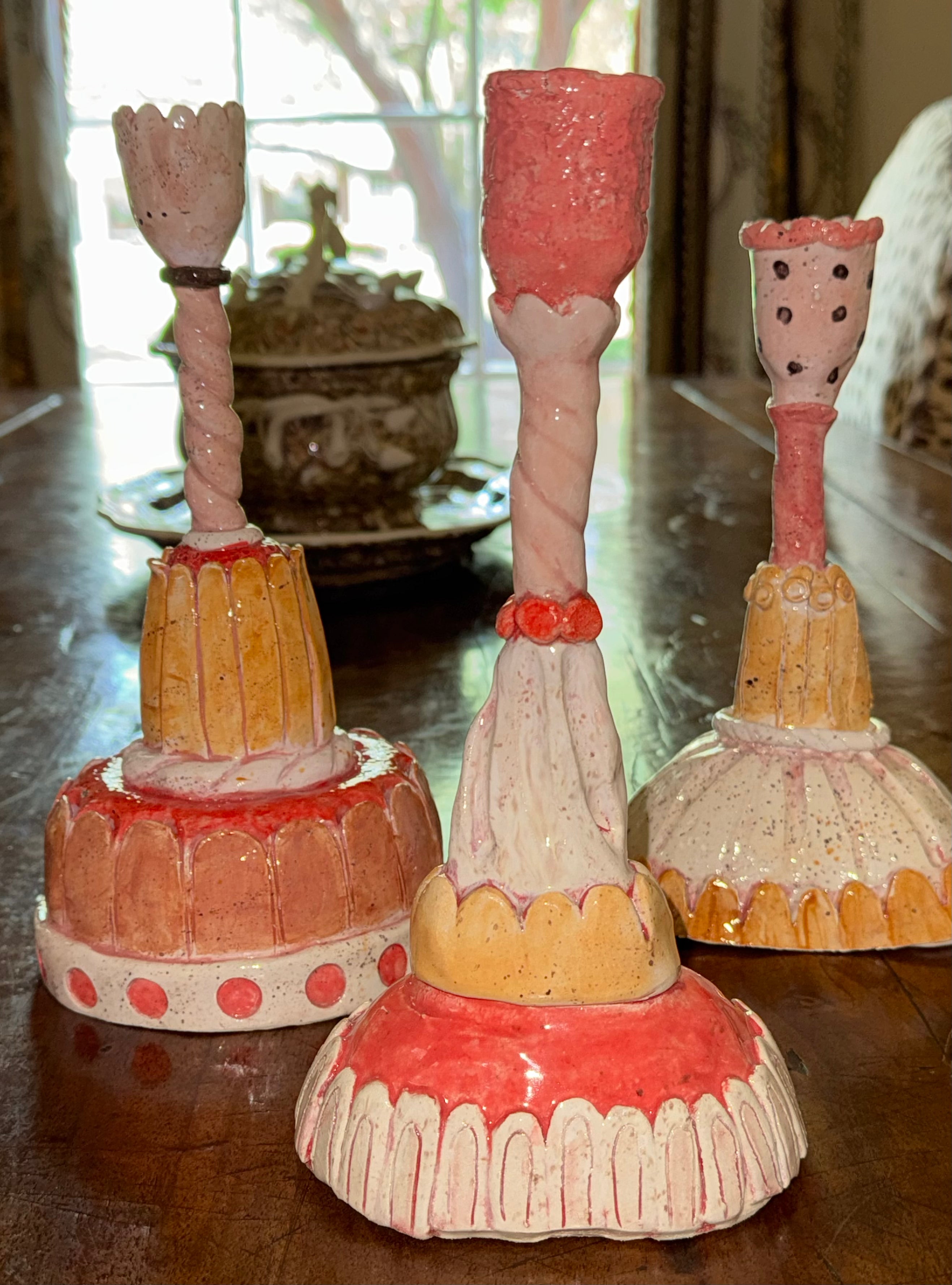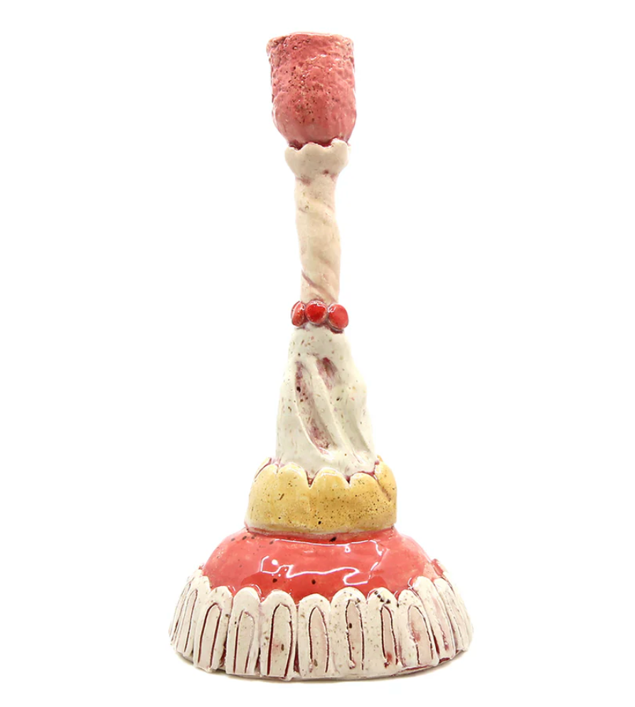 Amelia Tuttiett has created a wonderful collection of candleholders inspired by tiered Regency desserts of moulded jellies, ices, sugar work and blancmange, all depicted in 18th century illustrated dessert cookbooks. These ceramic versions delight in a mix of pastels resembling custards, sponge fingers and whipped cream in ceramic form.