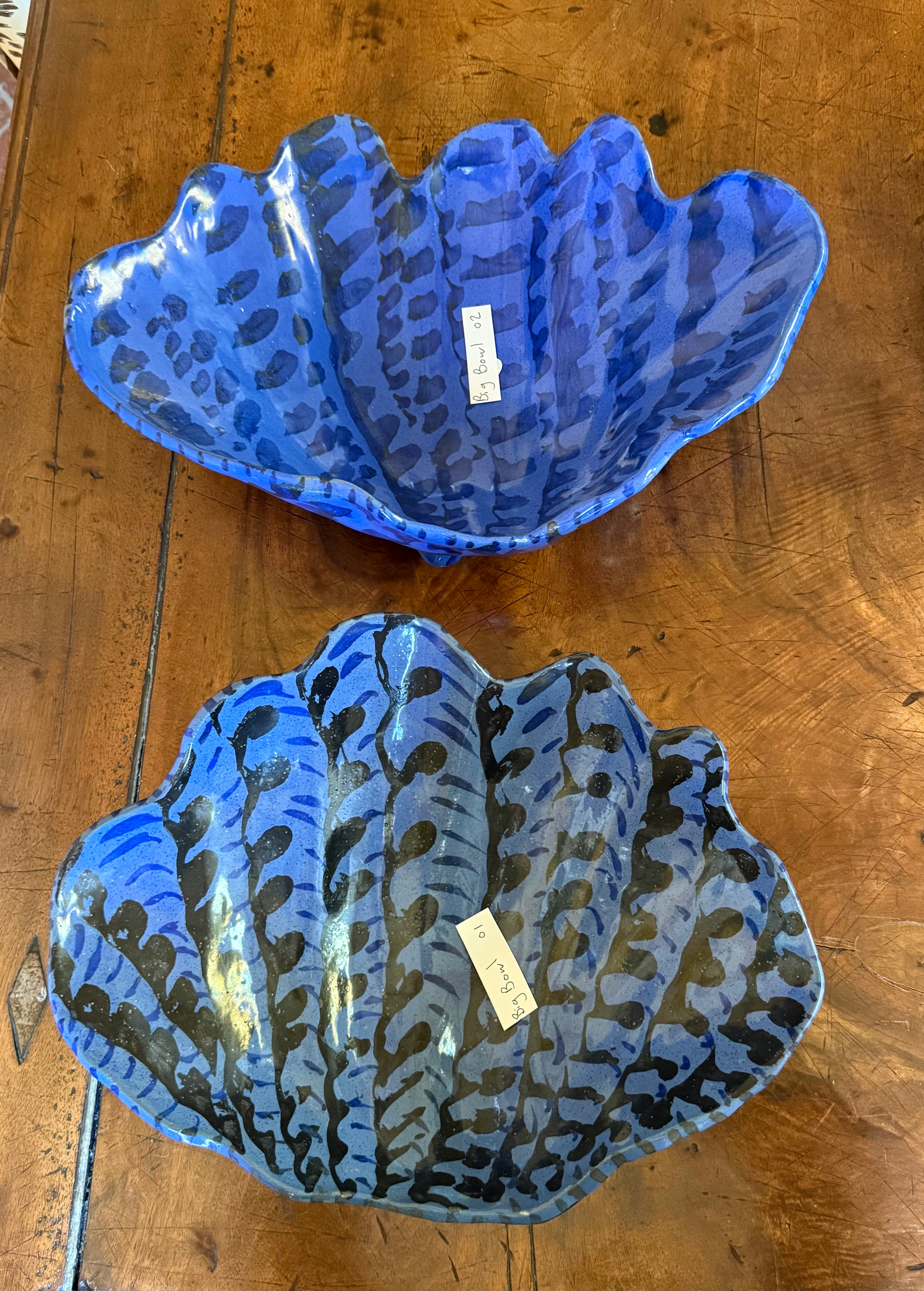 Each shell has a custom brass wire hanging device by wire artist George Magaso. The shells might look like plates, but do not be fooled; they are inferior performing plates! Due to their undulating edges, any sauce is sure to spill! It is recommended to keep them as purely decorative wall-hanging ceramics.