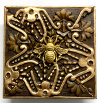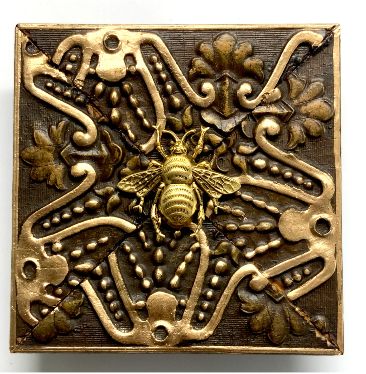 Trace Mayer uses antique frame fragments from 1860-80 to form charming and interesting shapes. In the center, various ornaments are showcased, the first of which was Napoleon's Bee. What has transpired over the years is a phenomenon anyone and everyone can get excited about and be a part of. Bees have expanded to include many other gems, including other animals, insects, and even personal items such as a medal or a unique family heirloom. Small antique objects are also showcased, including horse brass, pre-Columbian fragments, or small cameos.
